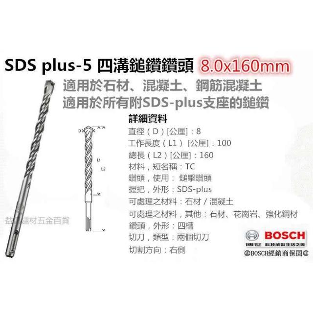 BOSCH 博世德國 BOSCH SDS plus-5 四溝鎚鑽鑽頭 8.0x160mm 適用於所有附SDS-plus支座的鎚鑽