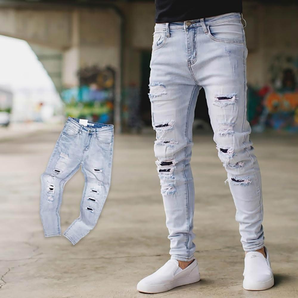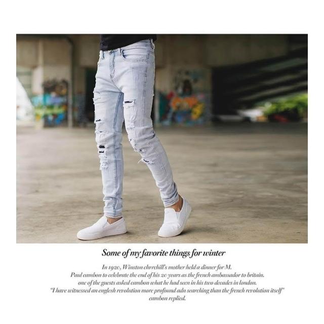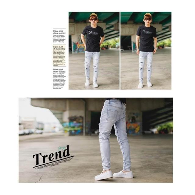 柒零年代 淺藍刷色抓破造型黑色補釘合身版牛仔褲_NB1303J(牛仔褲 褲子 男長褲 )