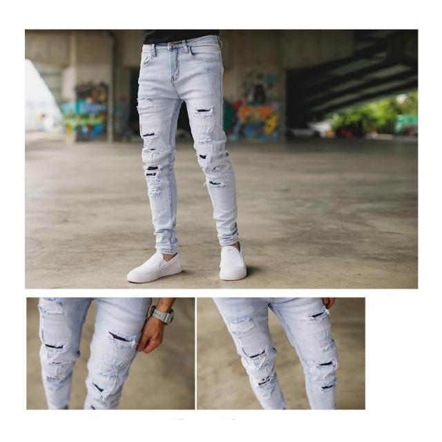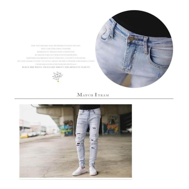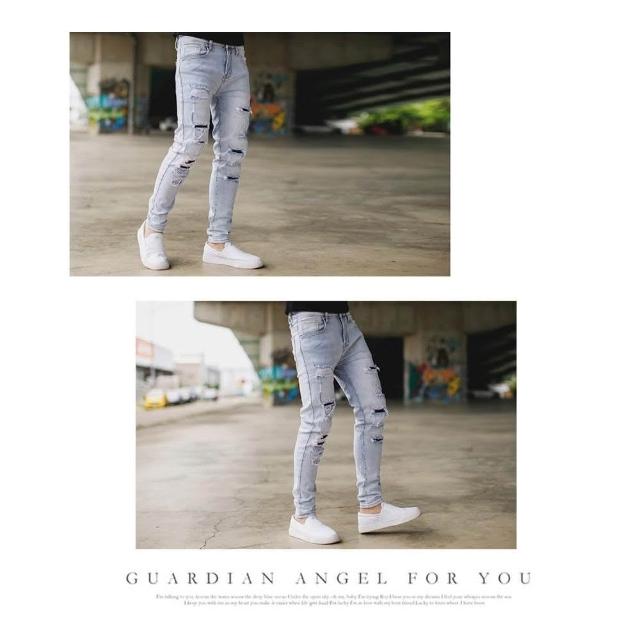 柒零年代 淺藍刷色抓破造型黑色補釘合身版牛仔褲_NB1303J(牛仔褲 褲子 男長褲 )