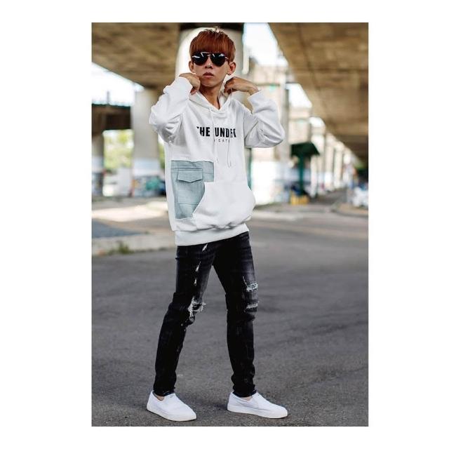 柒零年代 韓國製黑灰刷色不對稱抽鬚破洞補丁合身版牛仔褲_NB1385J(牛仔褲 長褲 褲子)