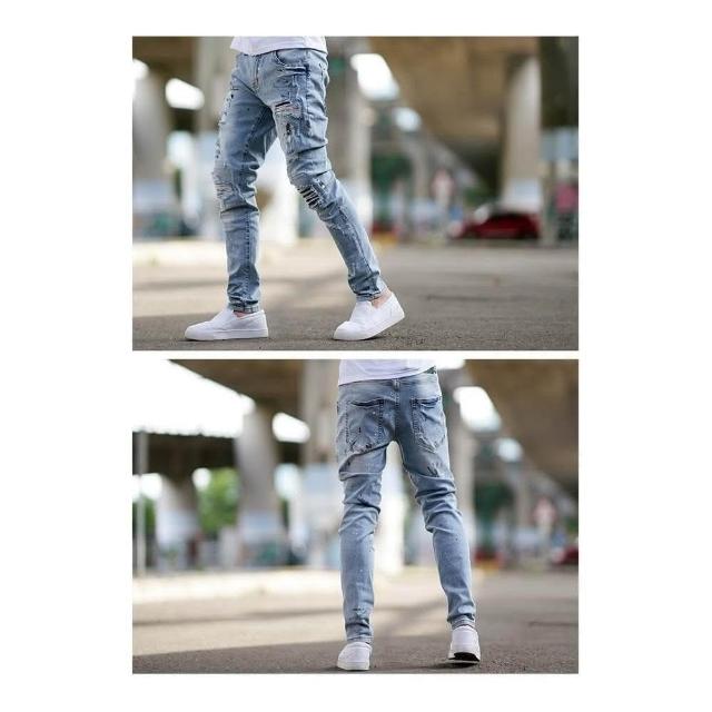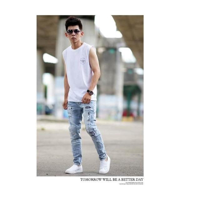 柒零年代 韓國製潑漆造型抽鬚破洞補丁合身版牛仔褲_NB1496J(牛仔褲 長褲 褲子)