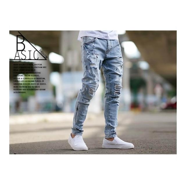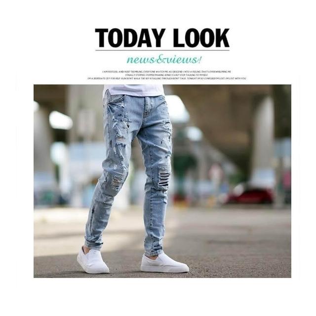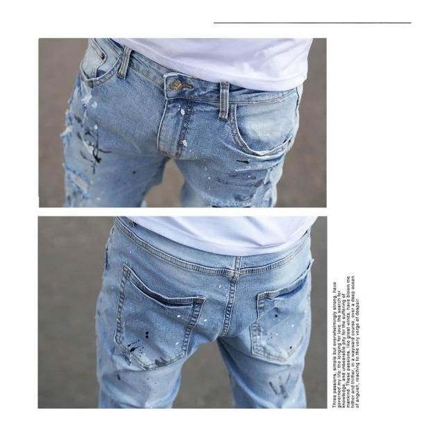 柒零年代 韓國製潑漆造型抽鬚破洞補丁合身版牛仔褲_NB1496J(牛仔褲 長褲 褲子)