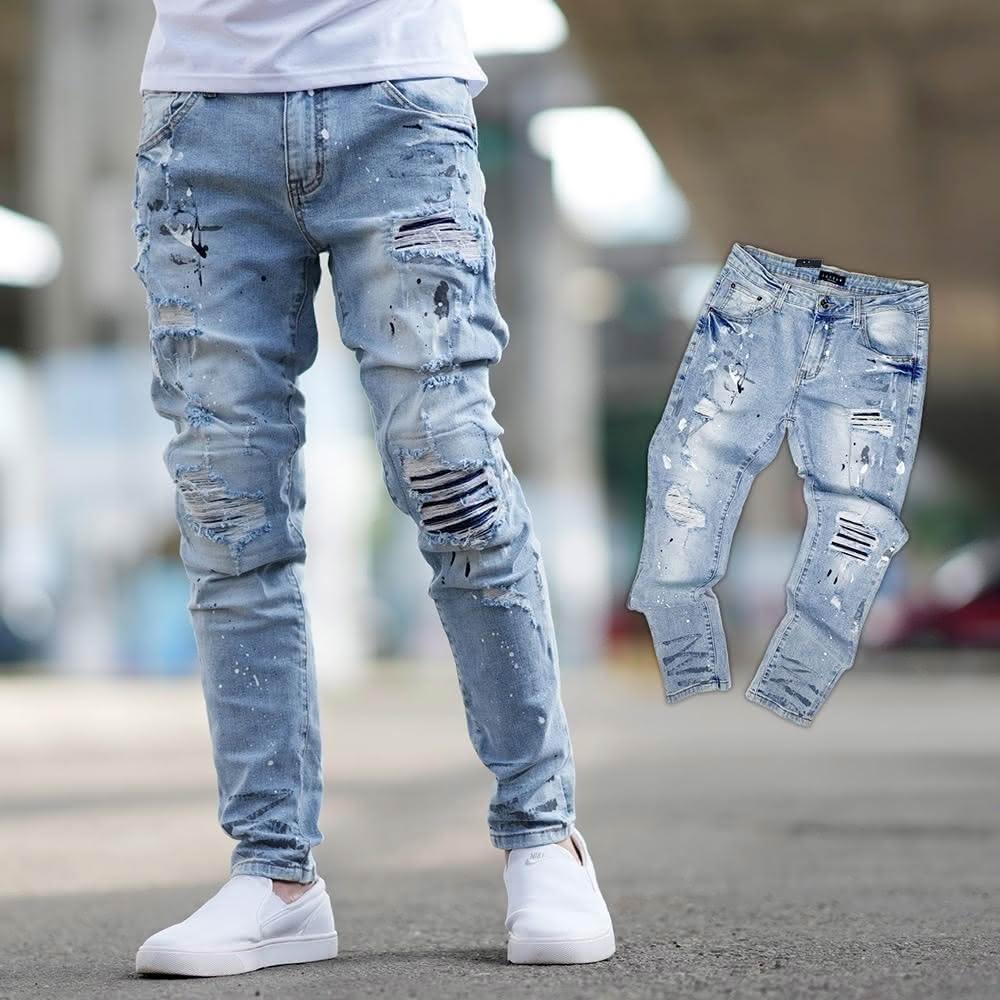 柒零年代 韓國製潑漆造型抽鬚破洞補丁合身版牛仔褲_NB1496J(牛仔褲 長褲 褲子)