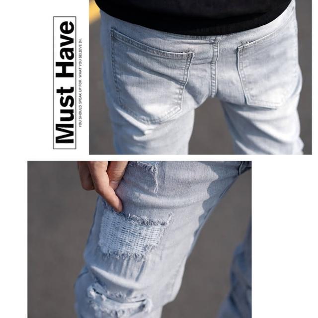 柒零年代 淺灰刷色破壞感刷破抽鬚補丁合身版彈性牛仔褲_NB1636J(牛仔褲 長褲 褲子)