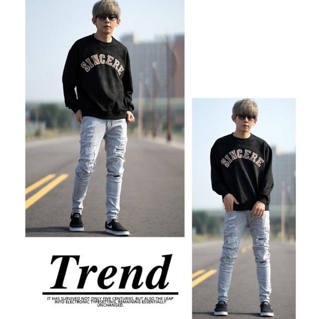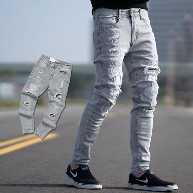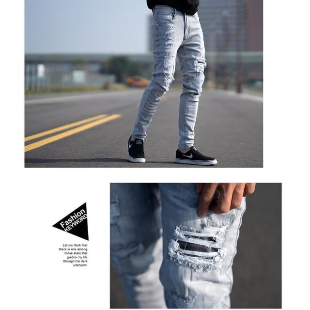 柒零年代 淺灰刷色破壞感刷破抽鬚補丁合身版彈性牛仔褲_NB1636J(牛仔褲 長褲 褲子)