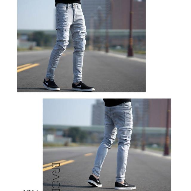 柒零年代 淺灰刷色破壞感刷破抽鬚補丁合身版彈性牛仔褲_NB1636J(牛仔褲 長褲 褲子)