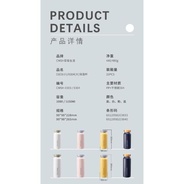 CMSH草莓生活 304不鏽鋼1000ml/1150ml大容量保溫杯 304不鏽鋼保溫環保咖啡杯 防漏旋轉杯蓋附提手