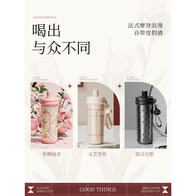CMSH草莓生活600ml大容量316不鏽鋼內膽保溫杯 大象杯 帶提繩不鏽鋼吸管奶茶杯 保溫防漏環保咖啡杯 不鏽鋼珍奶杯