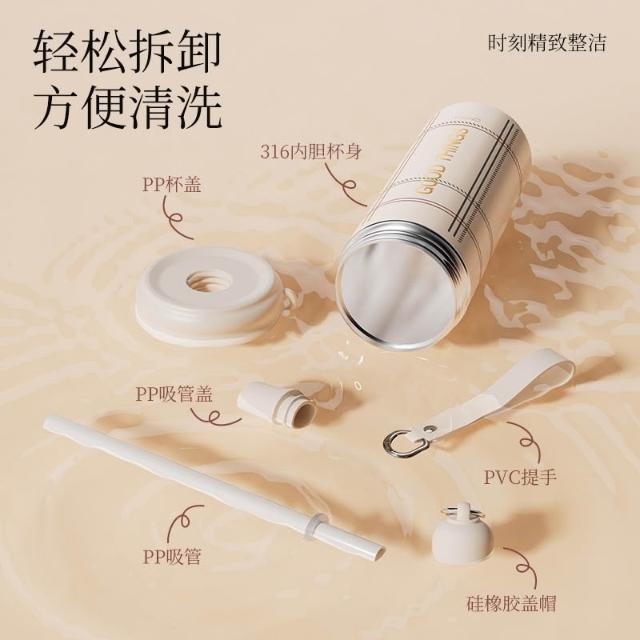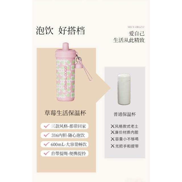 CMSH草莓生活600ml大容量316不鏽鋼內膽保溫杯 大象杯 帶提繩不鏽鋼吸管奶茶杯 保溫防漏環保咖啡杯 不鏽鋼珍奶杯