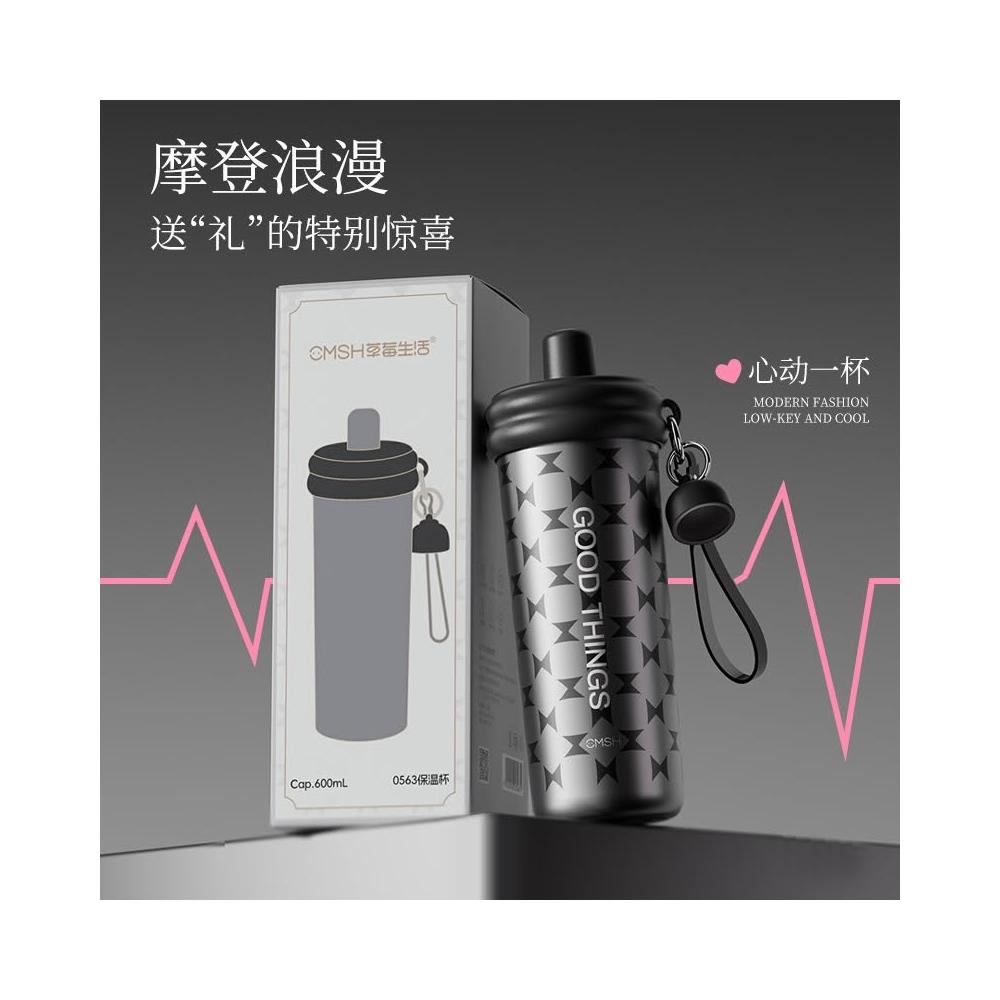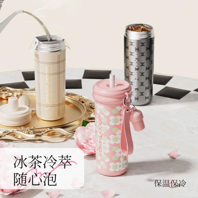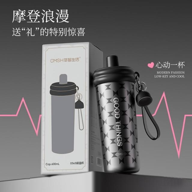 CMSH草莓生活600ml大容量316不鏽鋼內膽保溫杯 大象杯 帶提繩不鏽鋼吸管奶茶杯 保溫防漏環保咖啡杯 不鏽鋼珍奶杯