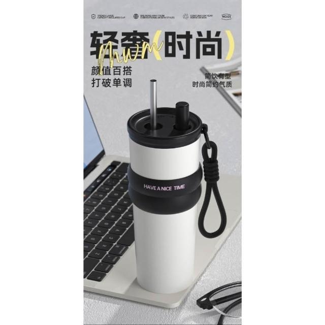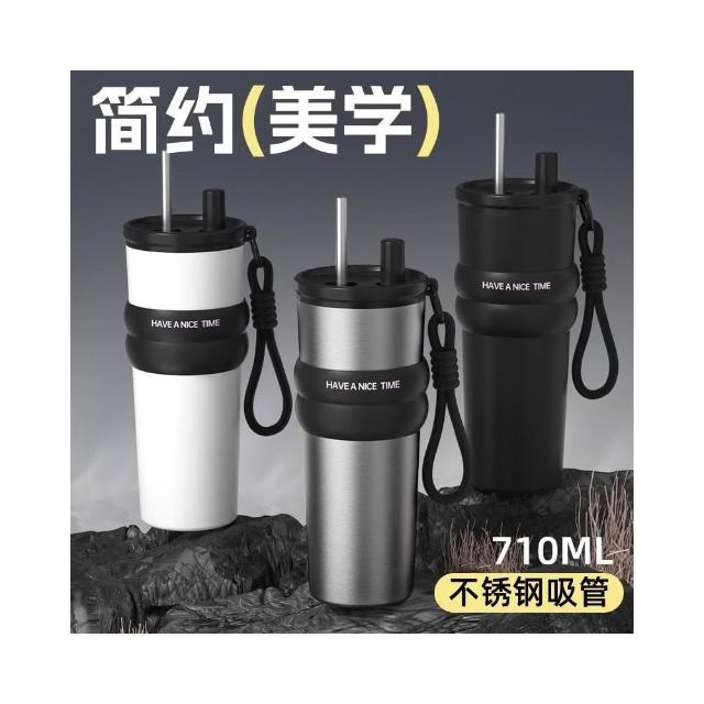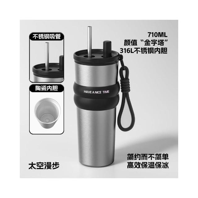 710ml大容量陶瓷內膽316不鏽鋼內膽保溫杯 不鏽鋼保溫大象杯 帶提繩不鏽鋼吸管奶茶杯 保溫防漏環保咖啡杯