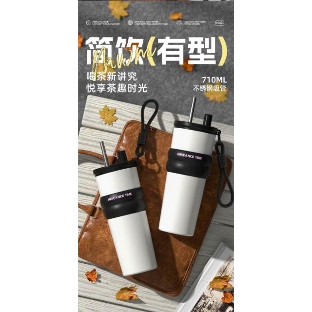 710ml大容量陶瓷內膽316不鏽鋼內膽保溫杯 不鏽鋼保溫大象杯 帶提繩不鏽鋼吸管奶茶杯 保溫防漏環保咖啡杯