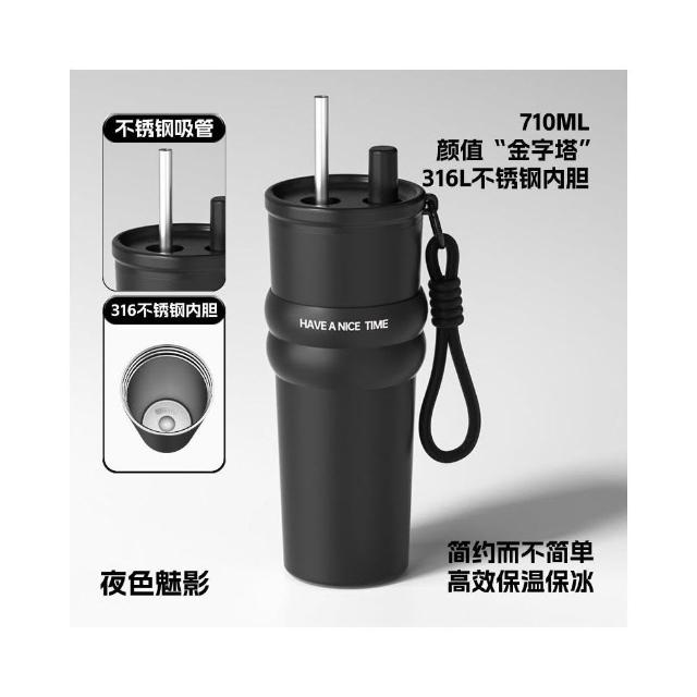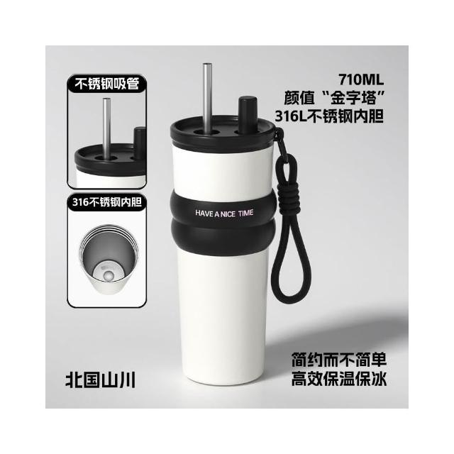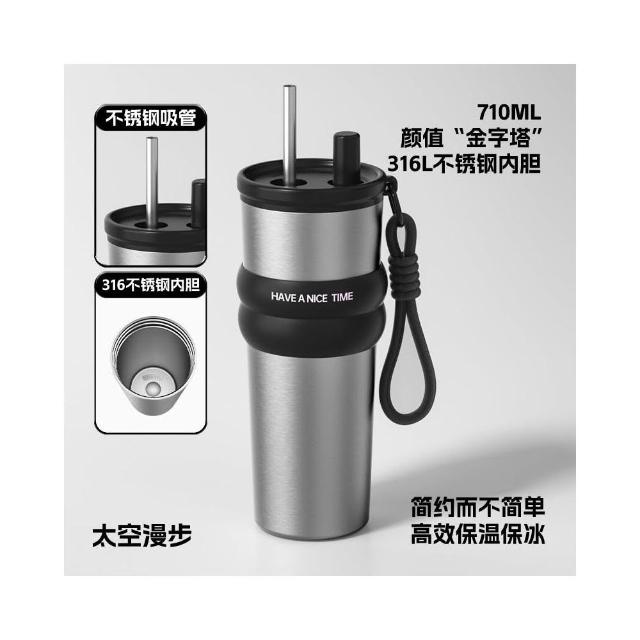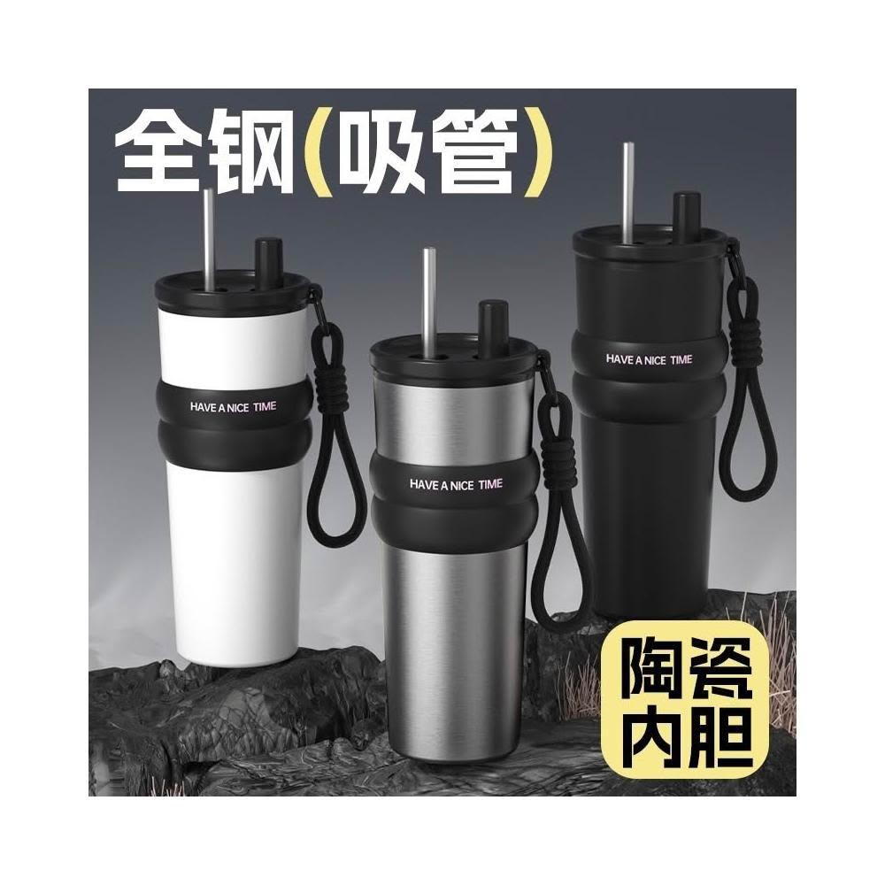 710ml大容量陶瓷內膽316不鏽鋼內膽保溫杯 不鏽鋼保溫大象杯 帶提繩不鏽鋼吸管奶茶杯 保溫防漏環保咖啡杯