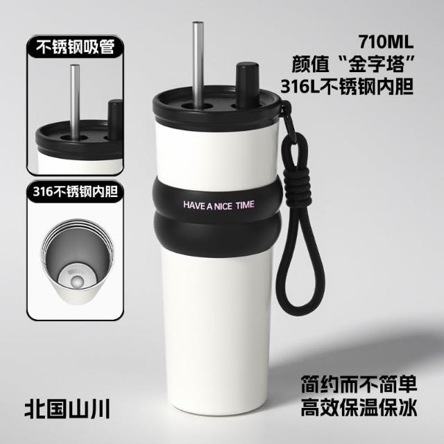 710ml大容量陶瓷內膽316不鏽鋼內膽保溫杯 不鏽鋼保溫大象杯 帶提繩不鏽鋼吸管奶茶杯 保溫防漏環保咖啡杯