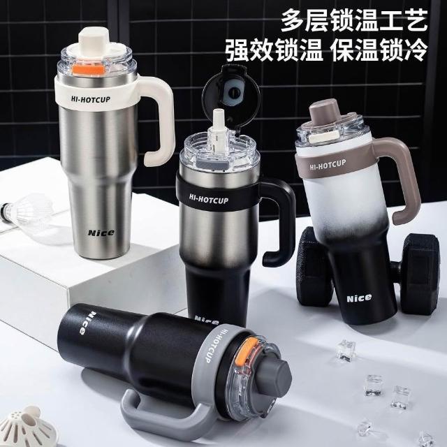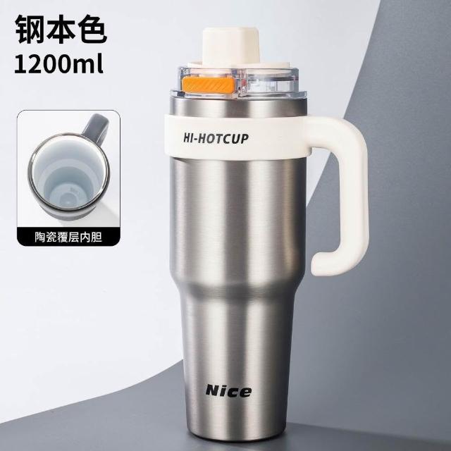 買一送一 新款 一鍵彈蓋保溫杯1200ml大容量冰霸杯 陶瓷涂層內膽 帶握把保溫杯 手把保溫大象杯 環保咖啡杯