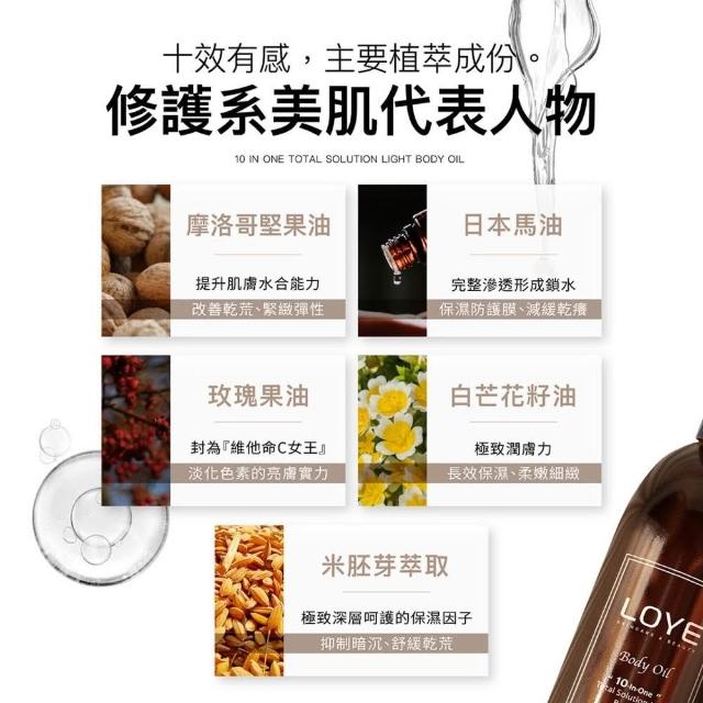 LOYE 樂妍10效輕潤修護身體油200ml | 一瓶到位的美體精華油 / 快速滲透不留油感 / 無雌激素,孕嬰、敏感肌安心適用