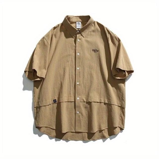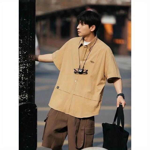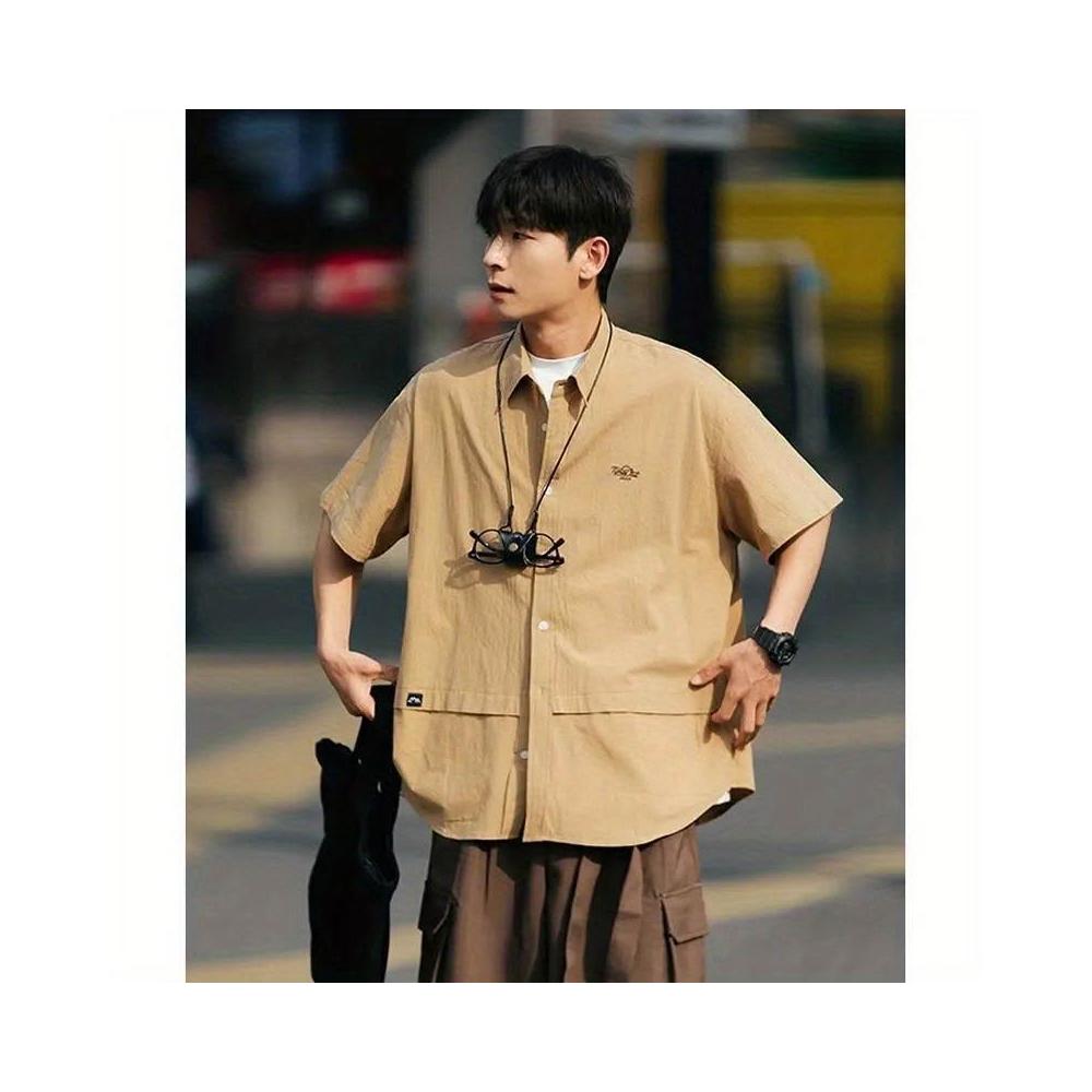 茂源優選日系復古短袖純色襯衫刺繡男夏季小衆設計感工裝潮寬鬆休閒襯衣男