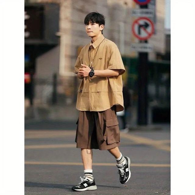茂源優選日系復古短袖純色襯衫刺繡男夏季小衆設計感工裝潮寬鬆休閒襯衣男