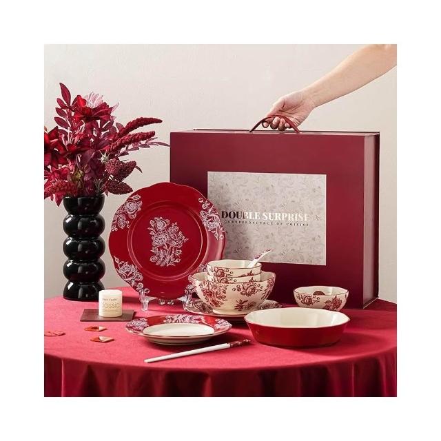 小慕Kogure 碗筷套裝 高檔碗碟餐具陶瓷 新婚禮物送新娘紅色碗盤筷套裝 喬遷新居結婚禮盒