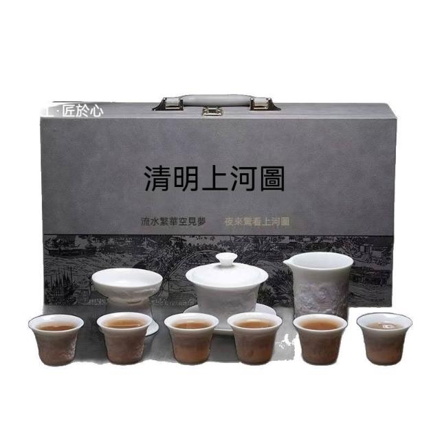 小慕KOGURE 羊脂玉素燒茶具套裝浮雕清明上圖功夫茶具德化白瓷中式存白帶禮盒