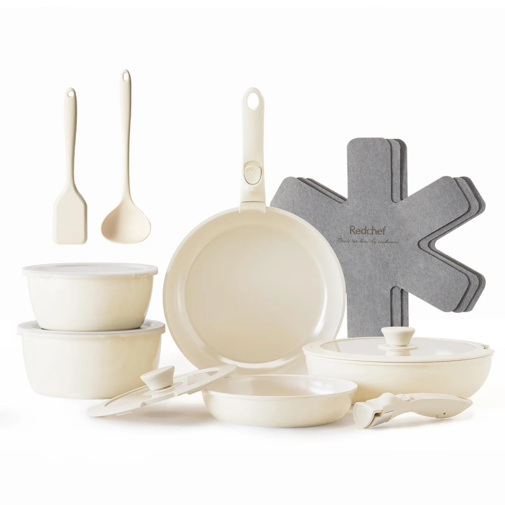 Redchef紅廚Redchef陶瓷岩不沾鍋具16件組白色可拆式手柄+20/26CM平底鍋/煎炒鍋+18/20CM奶鍋 IH電磁爐適用
