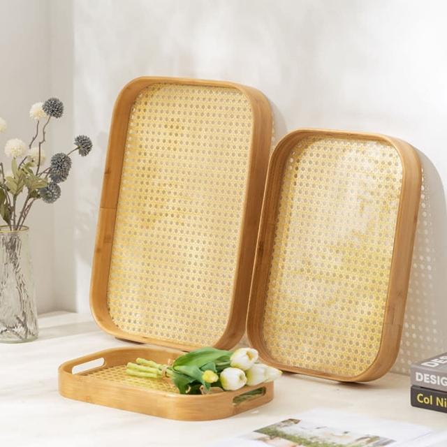 竹製藤編底托盤 |圓角手提木質托盤 竹製托盤 簡約托盤 木托盤(竹製托盤 木質托盤 日式托盤 木盤 餐盤 茶盤 竹製藤編底