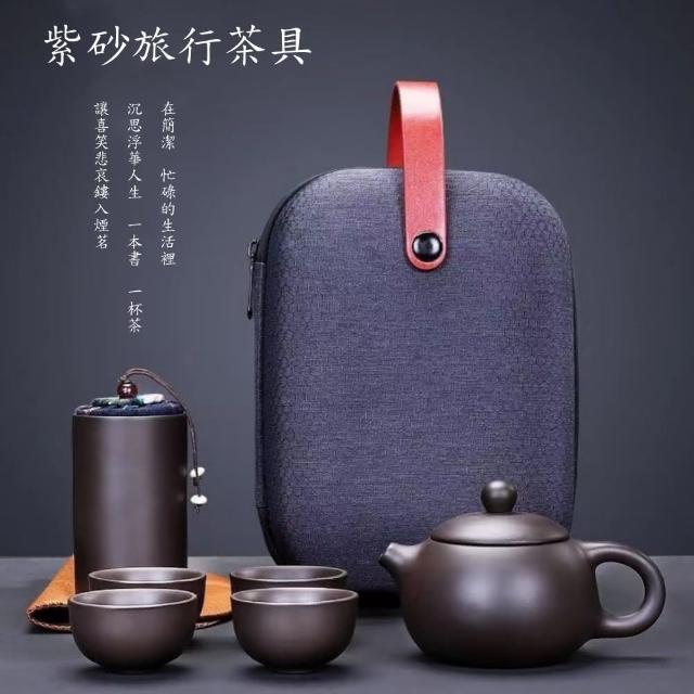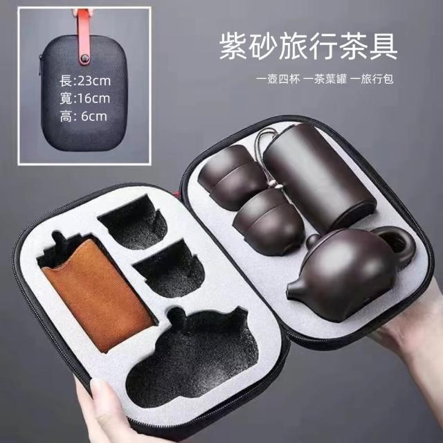 紫砂旅行茶具 一壺四杯+茶葉罐(外出泡茶組 泡茶壺 隨身車用旅行功夫茶具套裝 旅行茶具 快客杯 户外泡茶杯小套裝 快客壺 茶壺茶具)