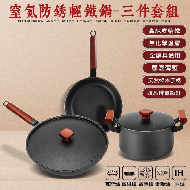 窒氮防鏽輕鐵鍋 豪華三件組 不挑爐具 無化學塗層 ( 不沾鍋 鐵鍋 煎鍋 平底鍋 湯鍋 鑄鐵鍋 炒鍋 廚具 )