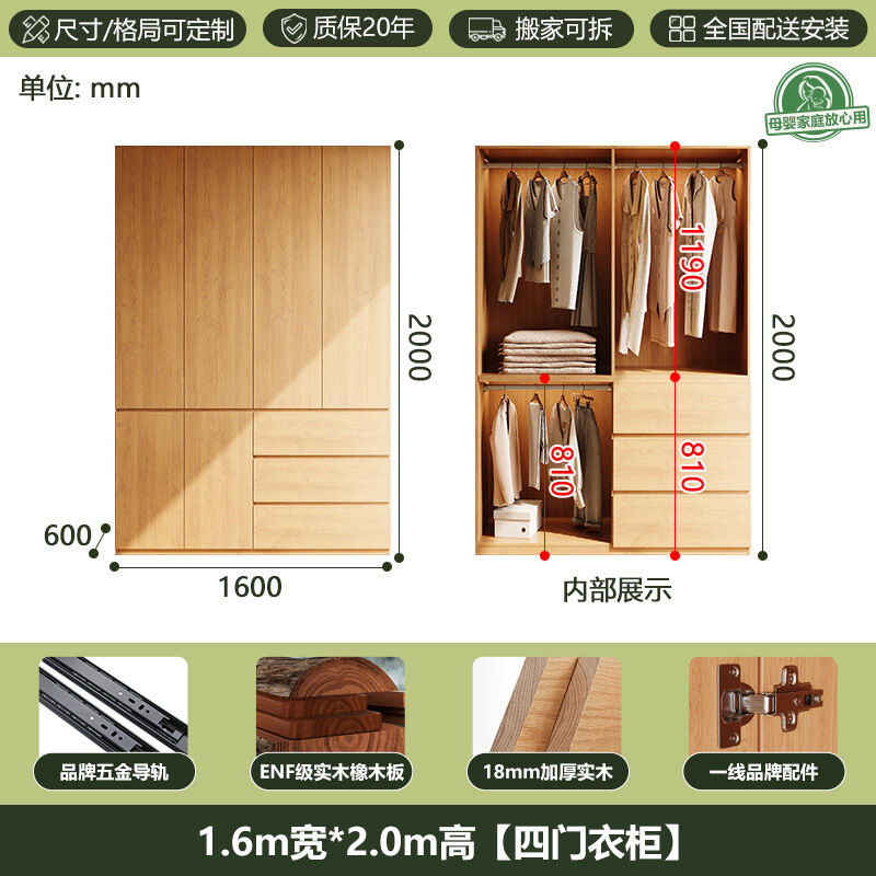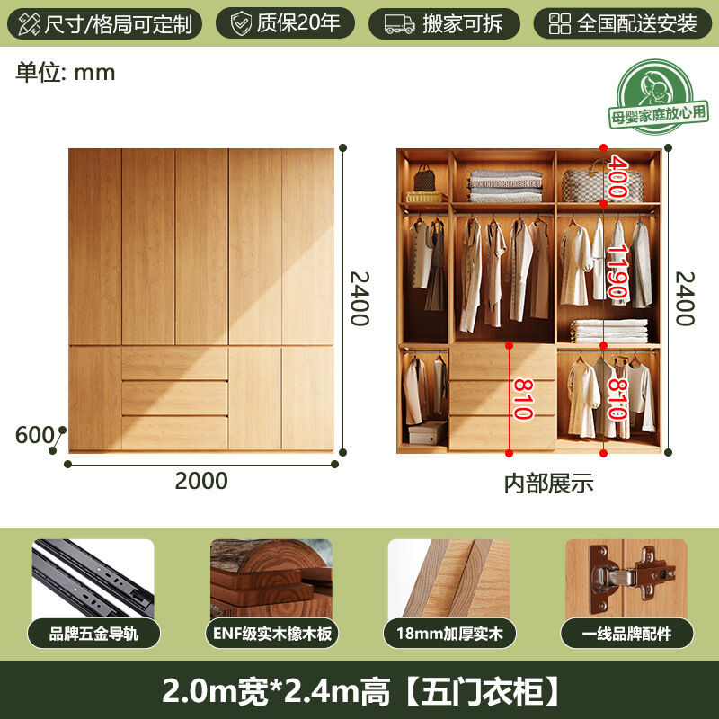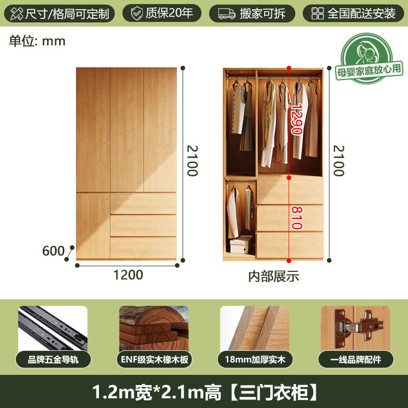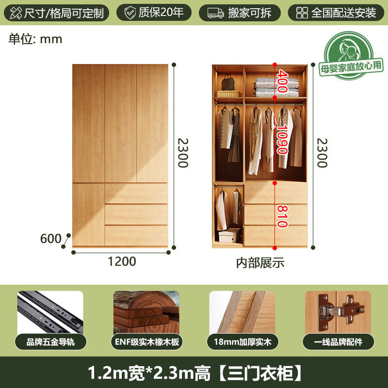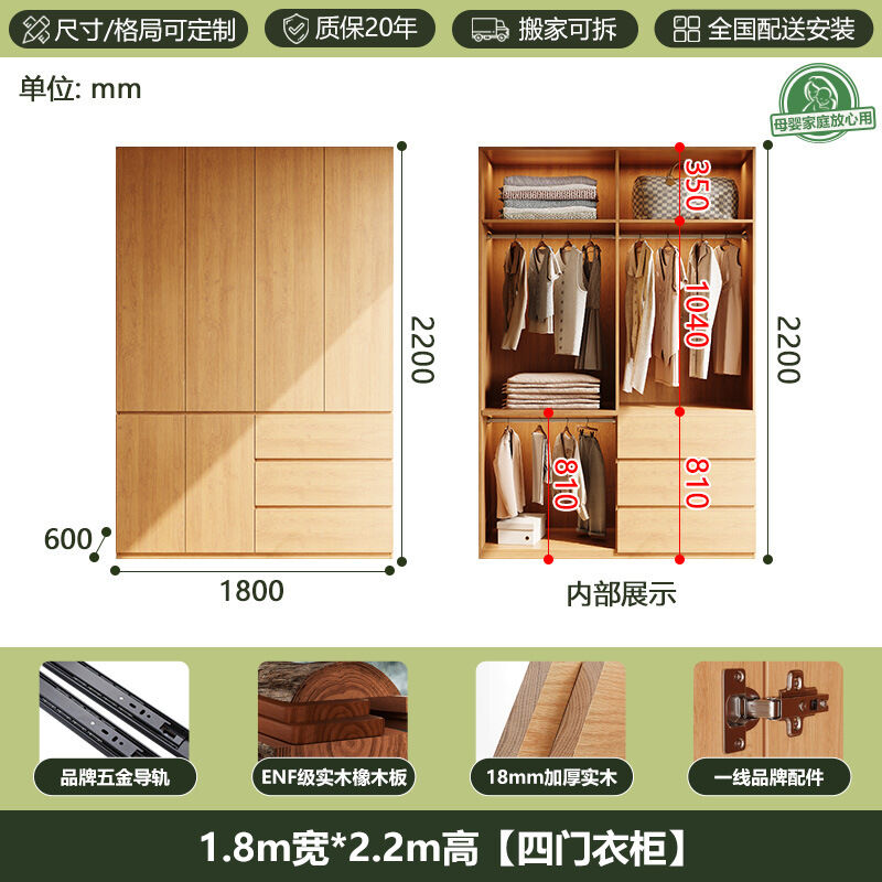 全實木ENF級橡木衣櫃原木風家用現代簡約櫃子分段式免拉手大衣櫥 b2b
