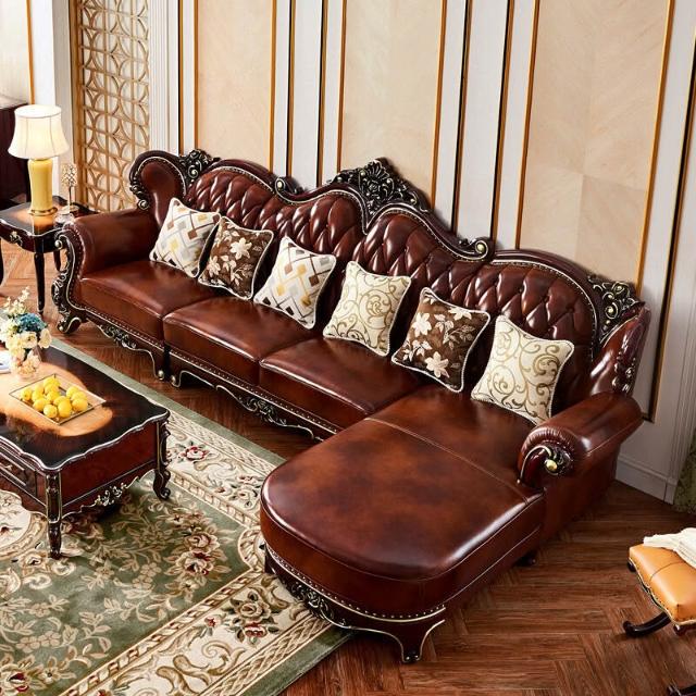 歐式真皮沙發奢華實木雕花頭層牛皮L型轉角沙發組合客廳美式家具 a11