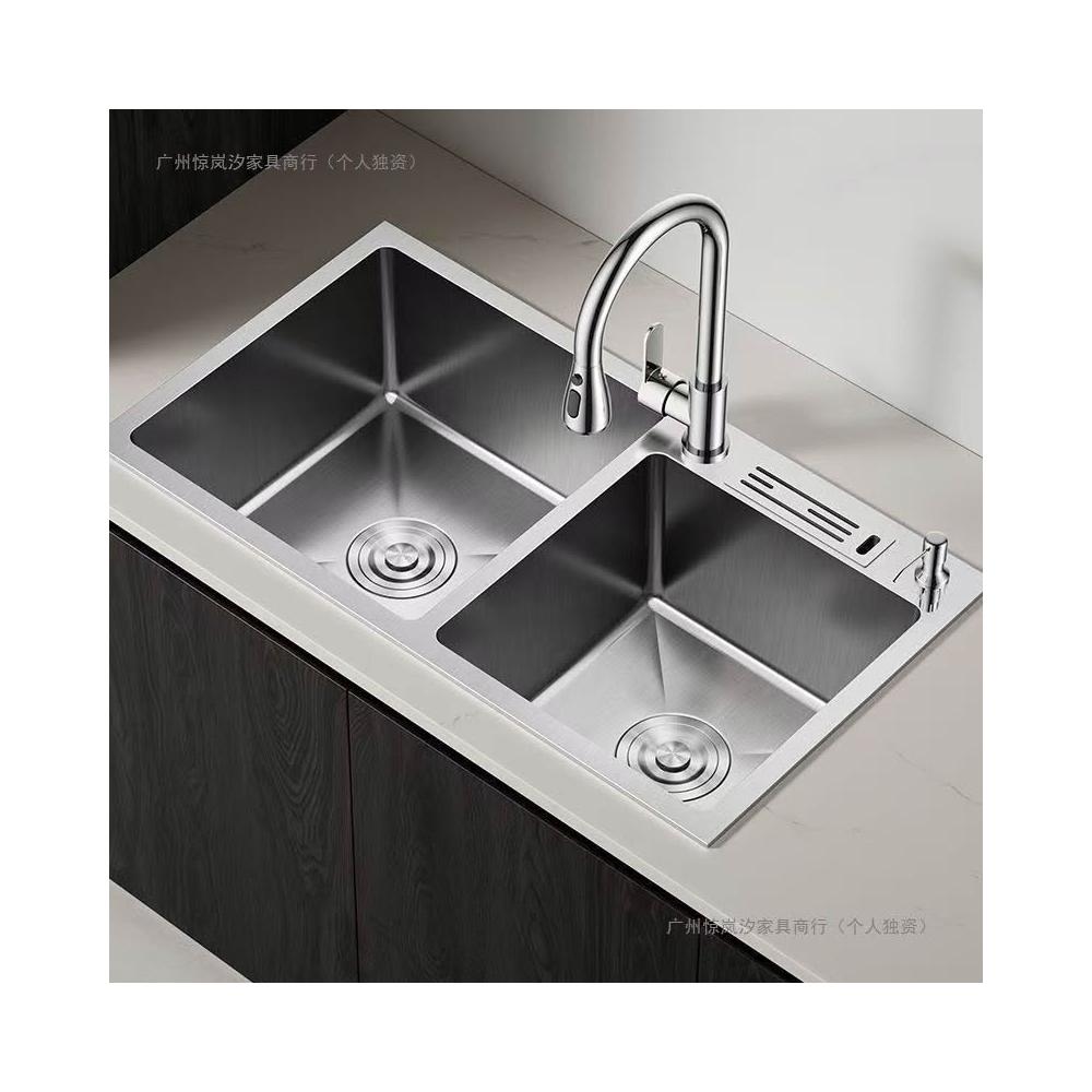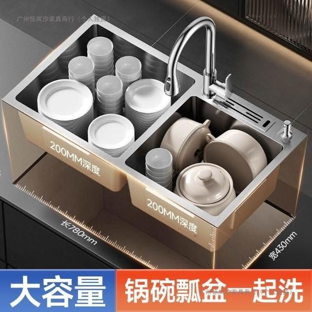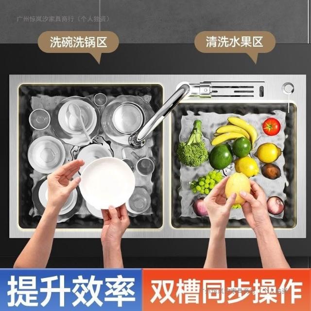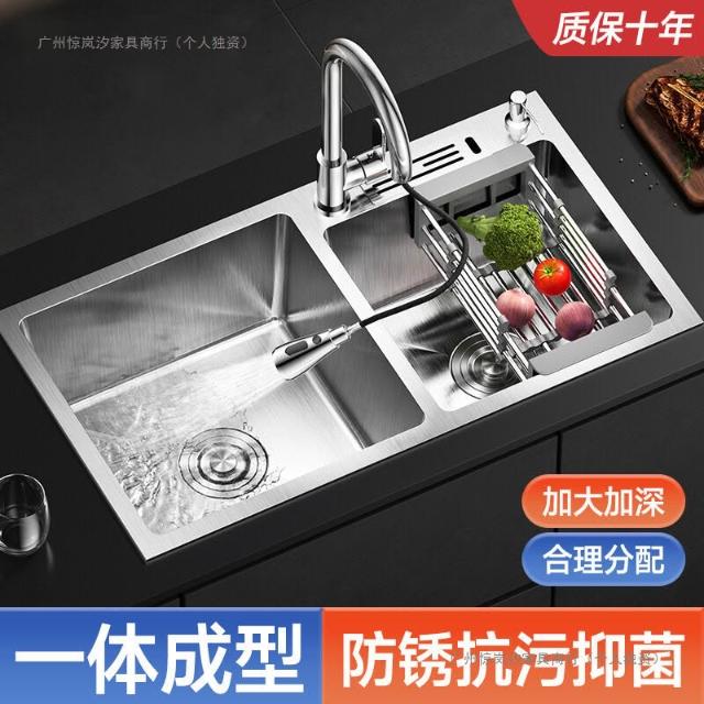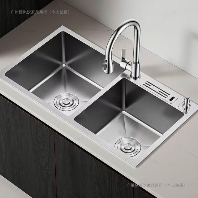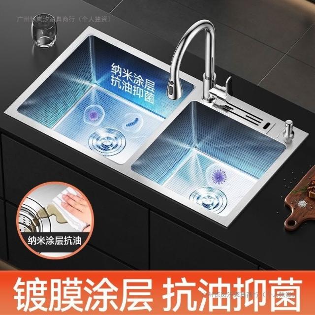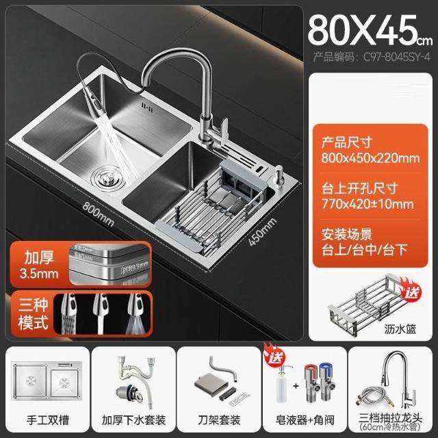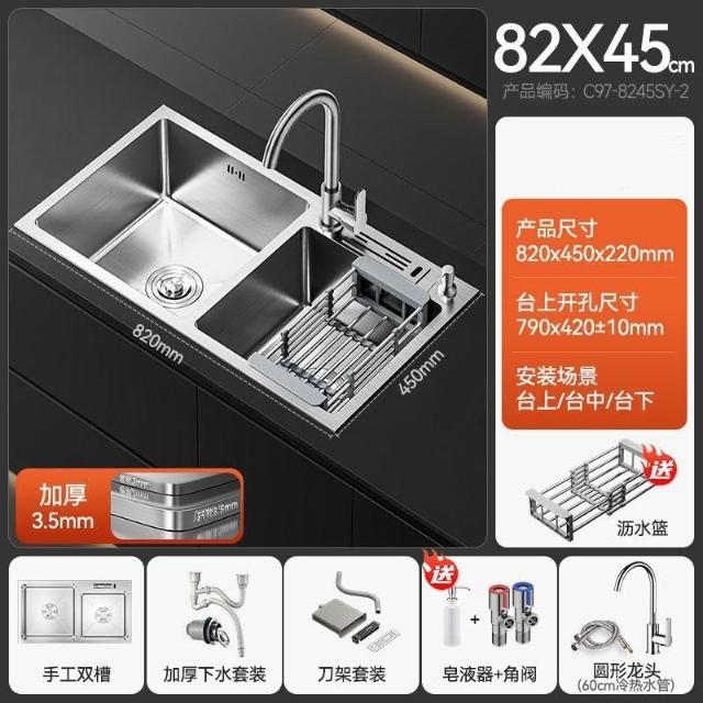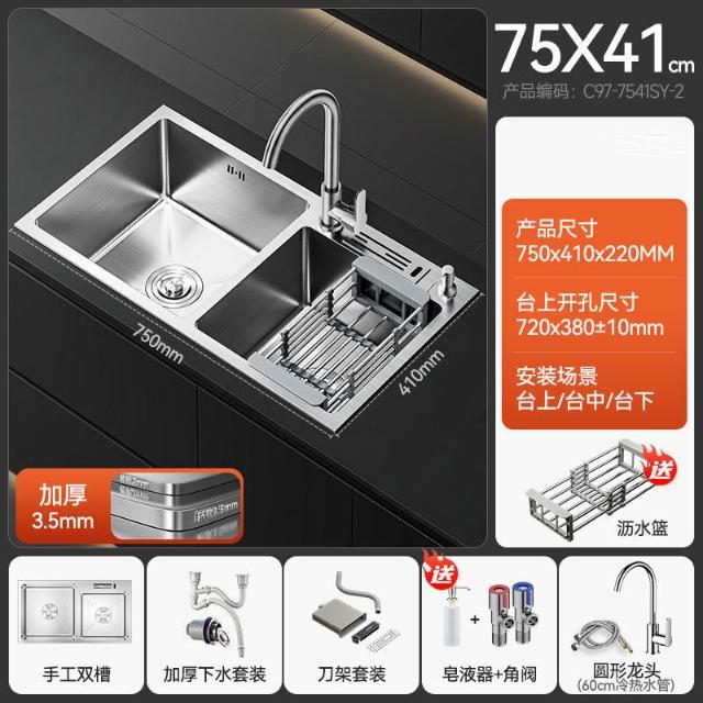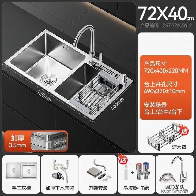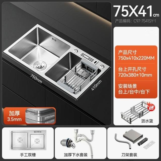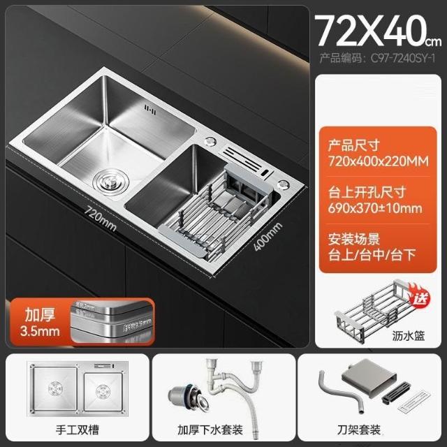 陶市手工加厚不銹鋼拉絲廚房水槽雙槽帶刀架家用洗菜盆洗碗池套裝 3