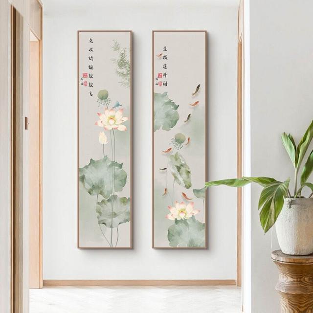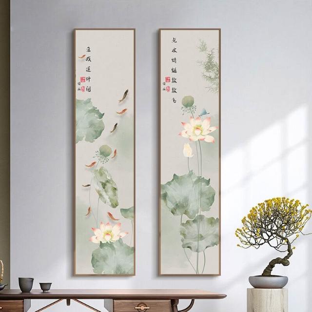 新中式玄關裝飾畫豎版窄長條形掛畫荷花家和酒店壁畫茶室走廊 308