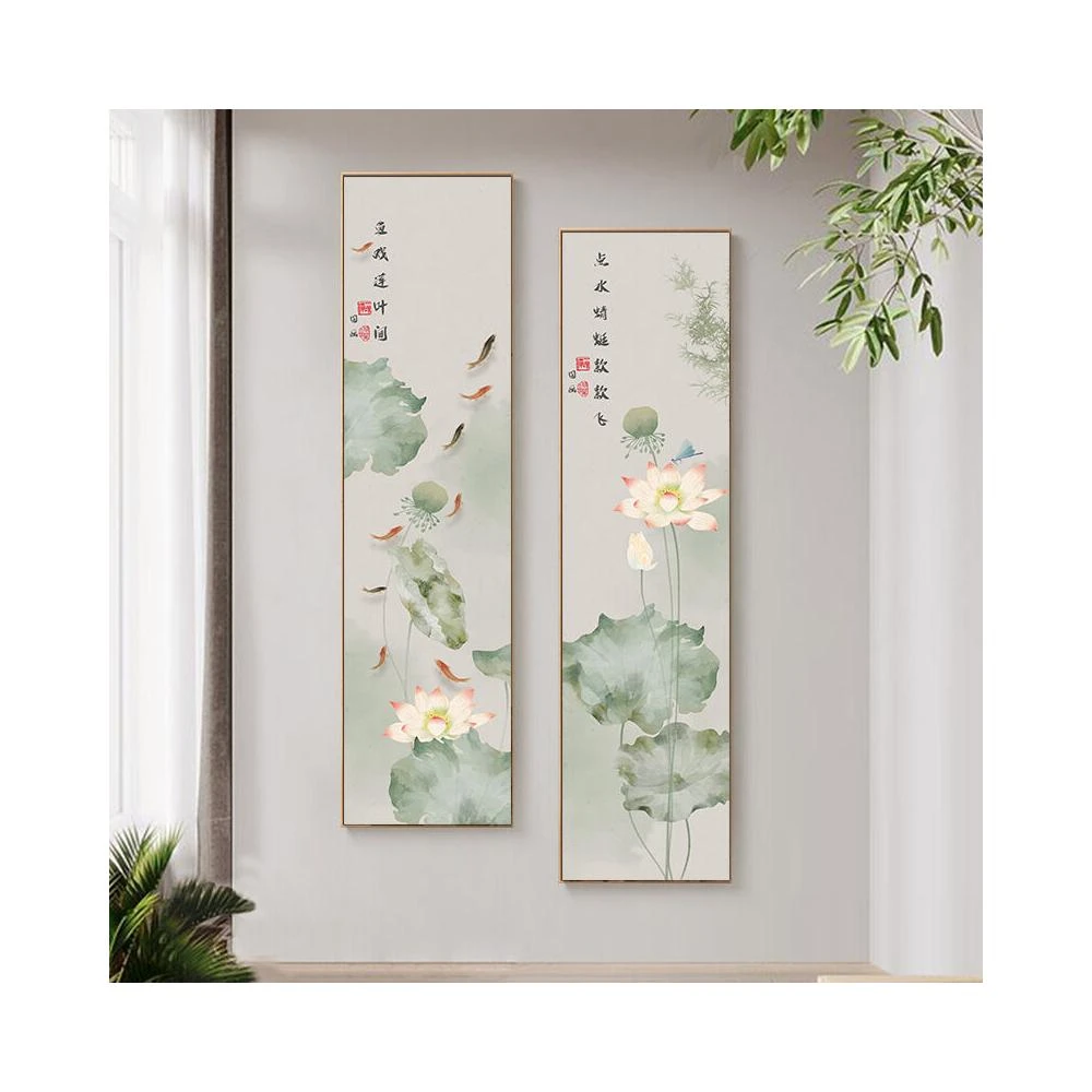 新中式玄關裝飾畫豎版窄長條形掛畫荷花家和酒店壁畫茶室走廊 308