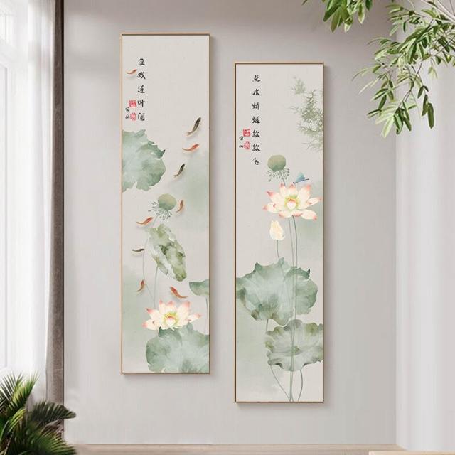 新中式玄關裝飾畫豎版窄長條形掛畫荷花家和酒店壁畫茶室走廊 308