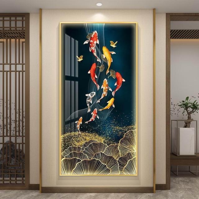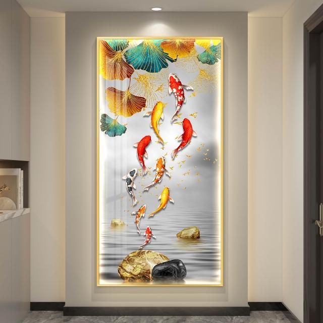 九魚圖入戶玄關裝飾畫燈光畫鯉魚蓮花畫高級感客廳過道背景墻掛畫 5a2