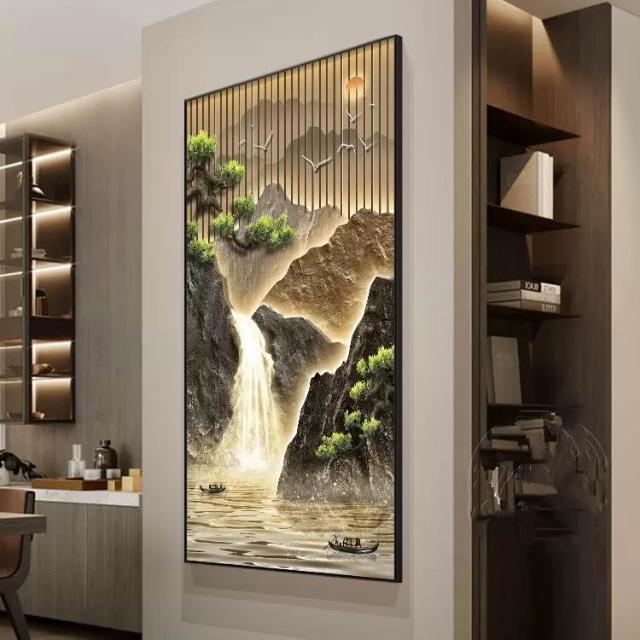 高山流水玄關裝飾畫入戶門走廊過道掛畫新中式山水豎版客廳帶燈畫 913