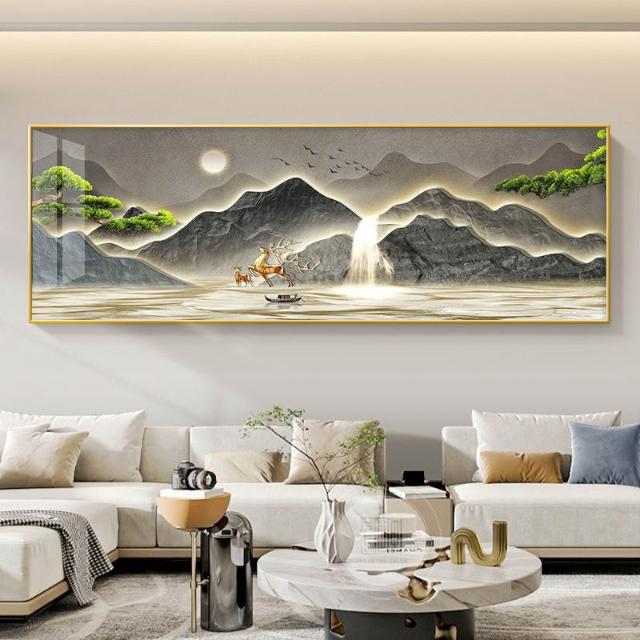 流水生財客廳裝飾畫新中式沙發背景墻掛畫迎客松禅意茶室山水壁畫 9a6