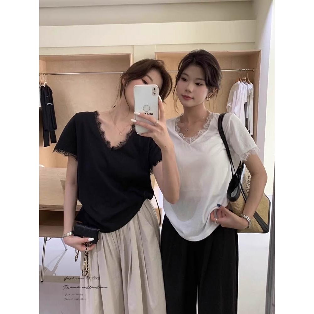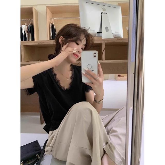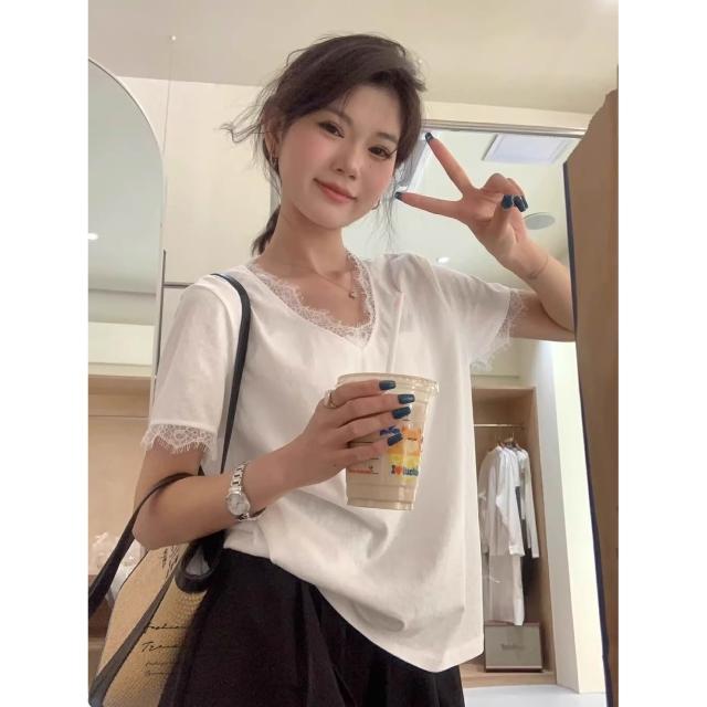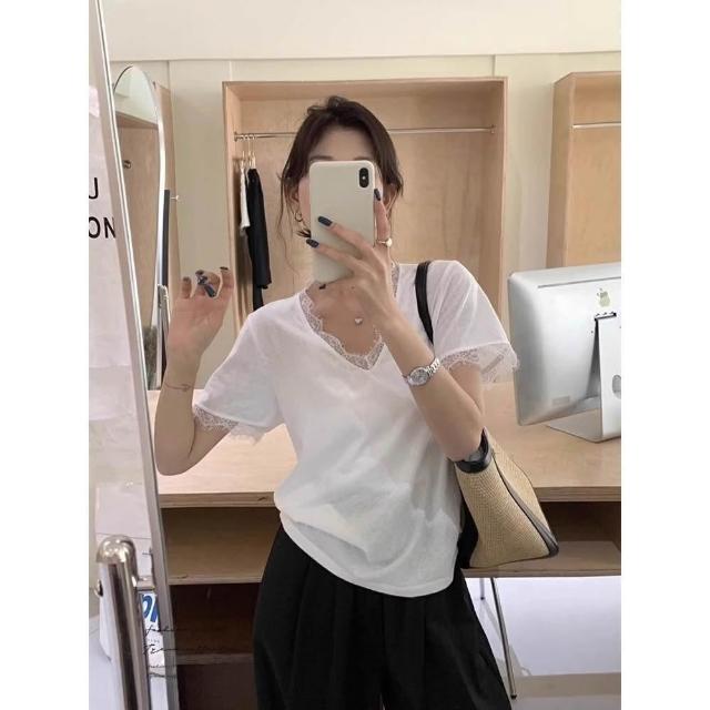 BAi 白媽媽睫毛蕾絲V領/法式氣質棉T- 350426 現貨+預購