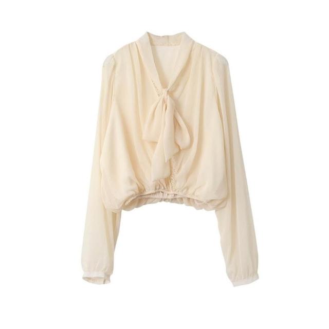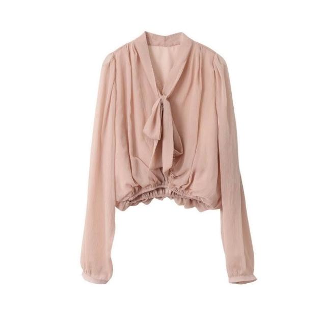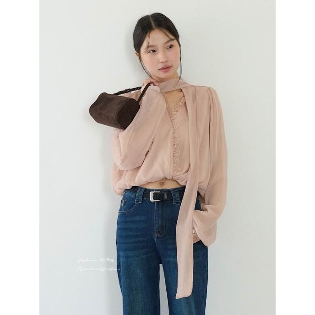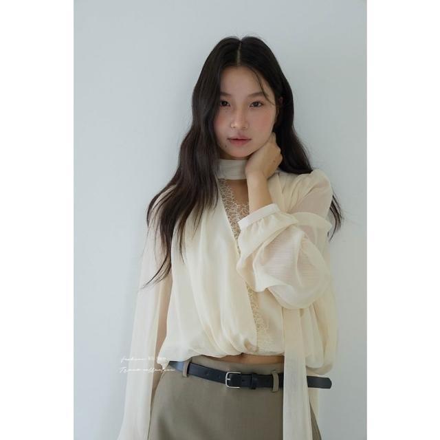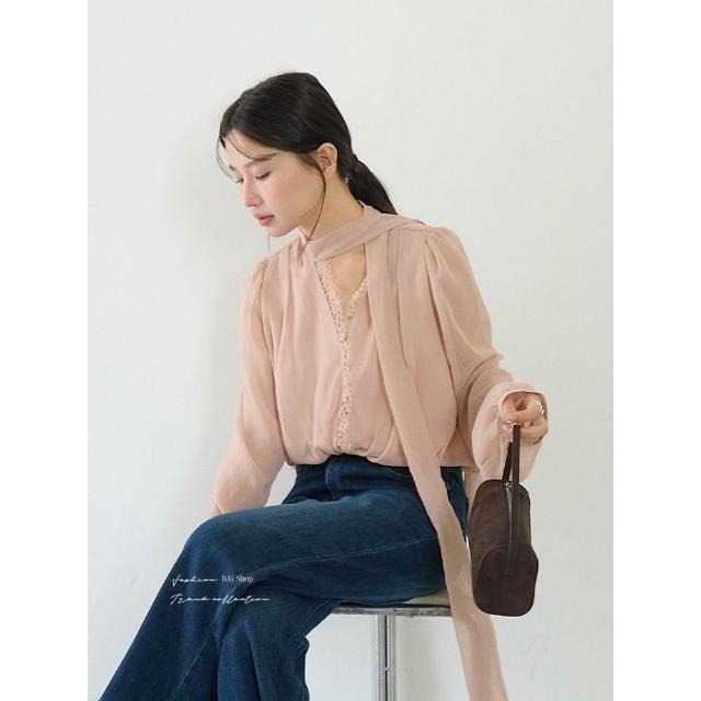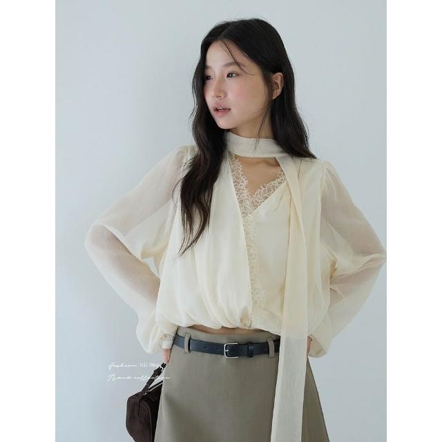 BAi 白媽媽飄帶雪紡上衣/V領蕾絲收腰短版長袖衫 性感百搭-350568 現貨+預購