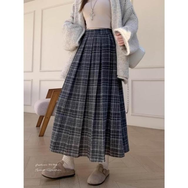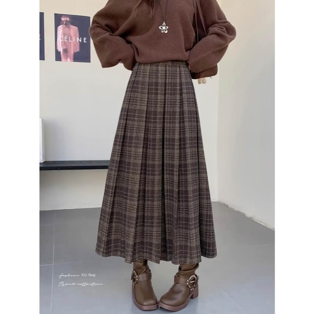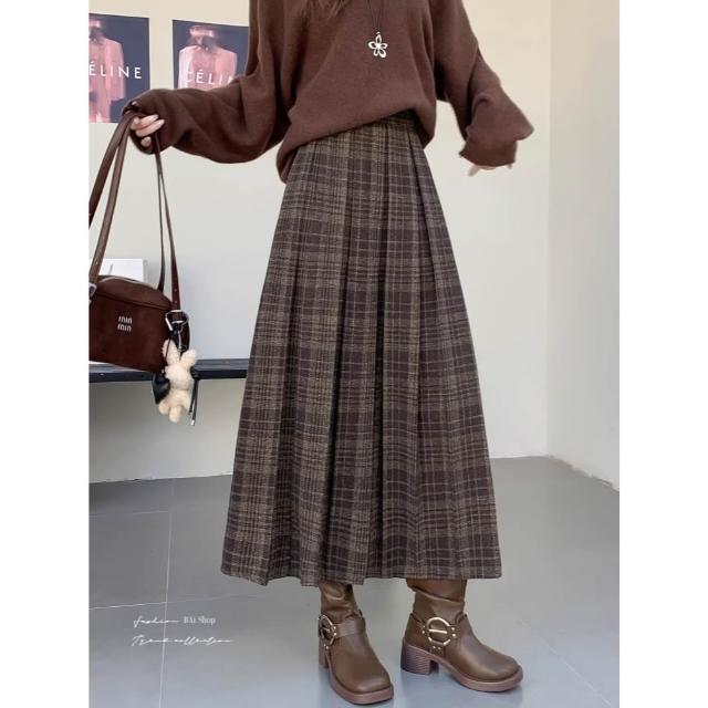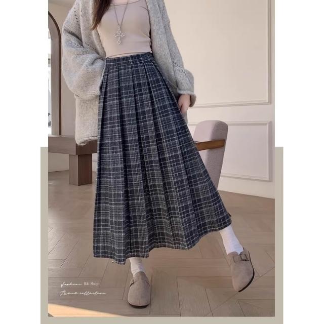 BAi 白媽媽百褶格紋長裙/韓系冬季毛料學院風復古裙-350742 現貨+預購