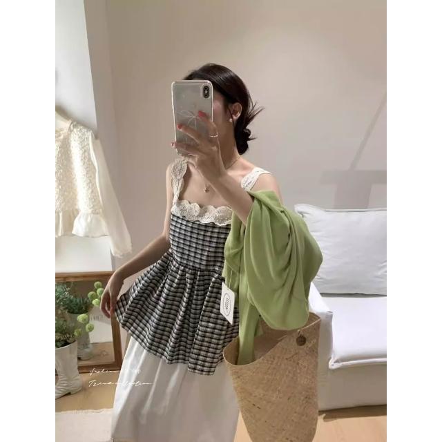 BAi 白媽媽格紋蕾絲拼接背心/日系甜美方格上衣-360067 現貨+預購