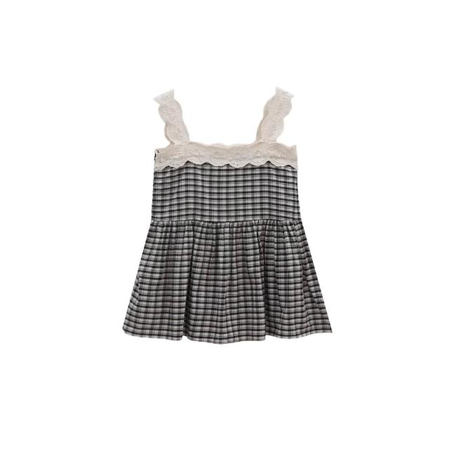 BAi 白媽媽格紋蕾絲拼接背心/日系甜美方格上衣-360067 現貨+預購