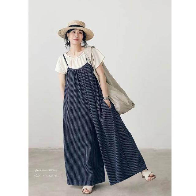 BAi 白媽媽條紋背帶褲/日系文青顯瘦闊腿寬鬆連身吊帶褲-360051 現貨+預購