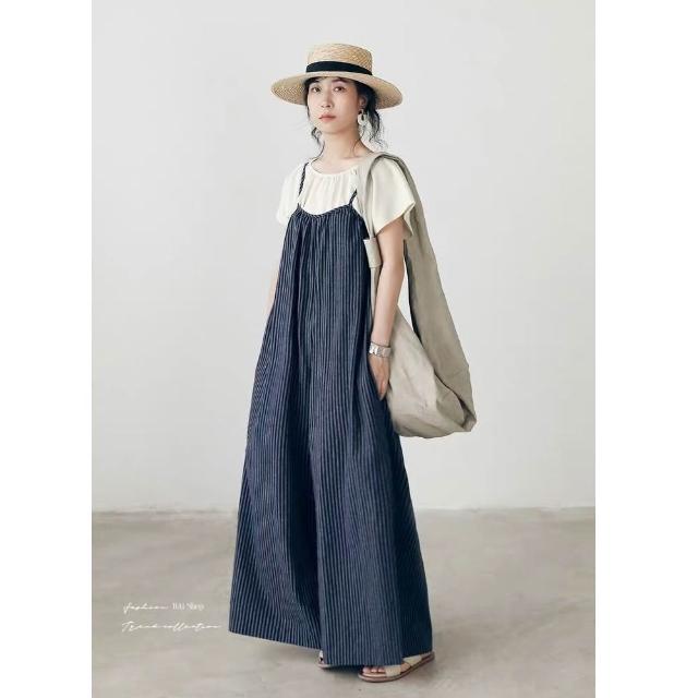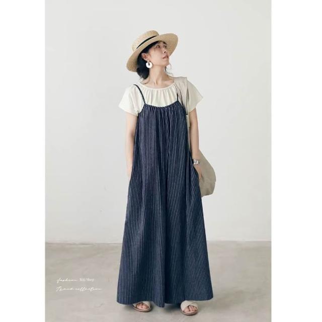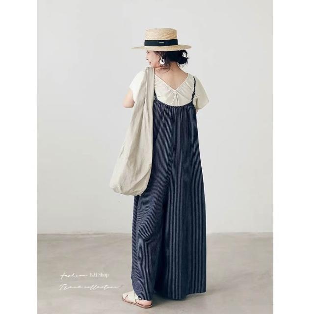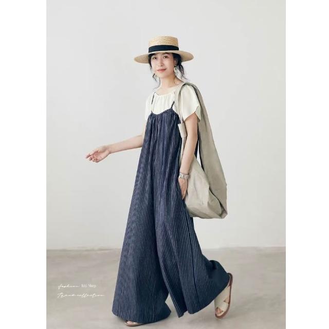 BAi 白媽媽條紋背帶褲/日系文青顯瘦闊腿寬鬆連身吊帶褲-360051 現貨+預購