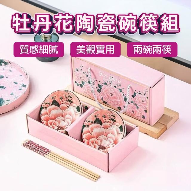*小珍* 免運 牡丹花陶瓷碗筷組 禮品 送禮 碗筷套組 禮盒 陶瓷碗 餐具 家用碗筷 陶瓷碗組 釉下彩