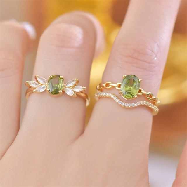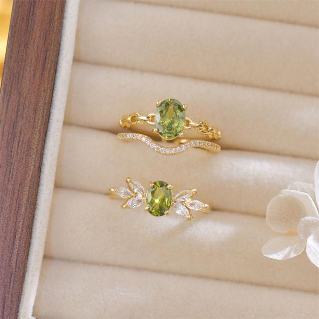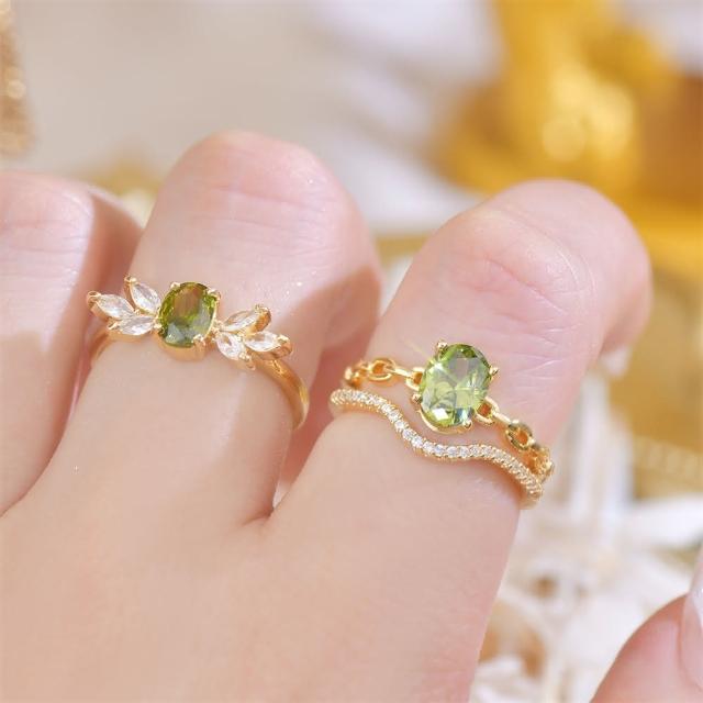PoemAcc 鋯石輕奢戒指 橄欖綠紫色鋯石戒指(雙層鋯石鏈條戒指 法式輕奢設計 戒指 開口戒)