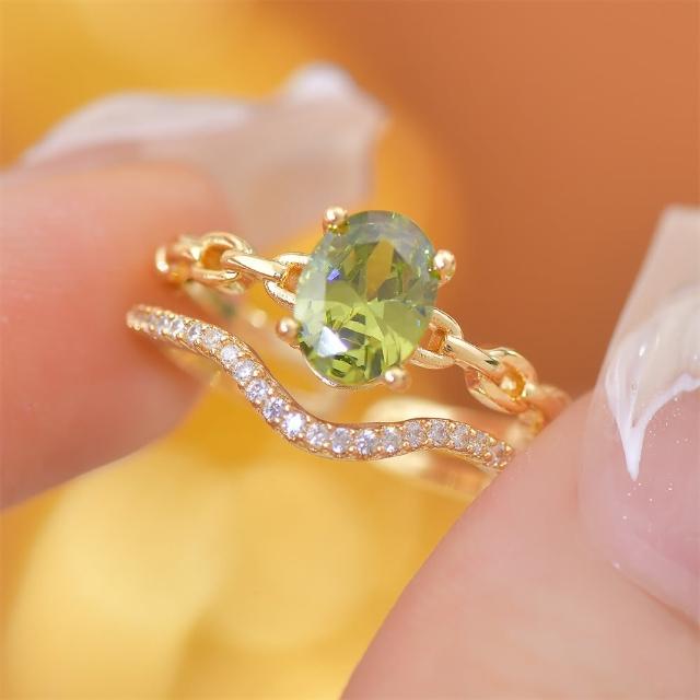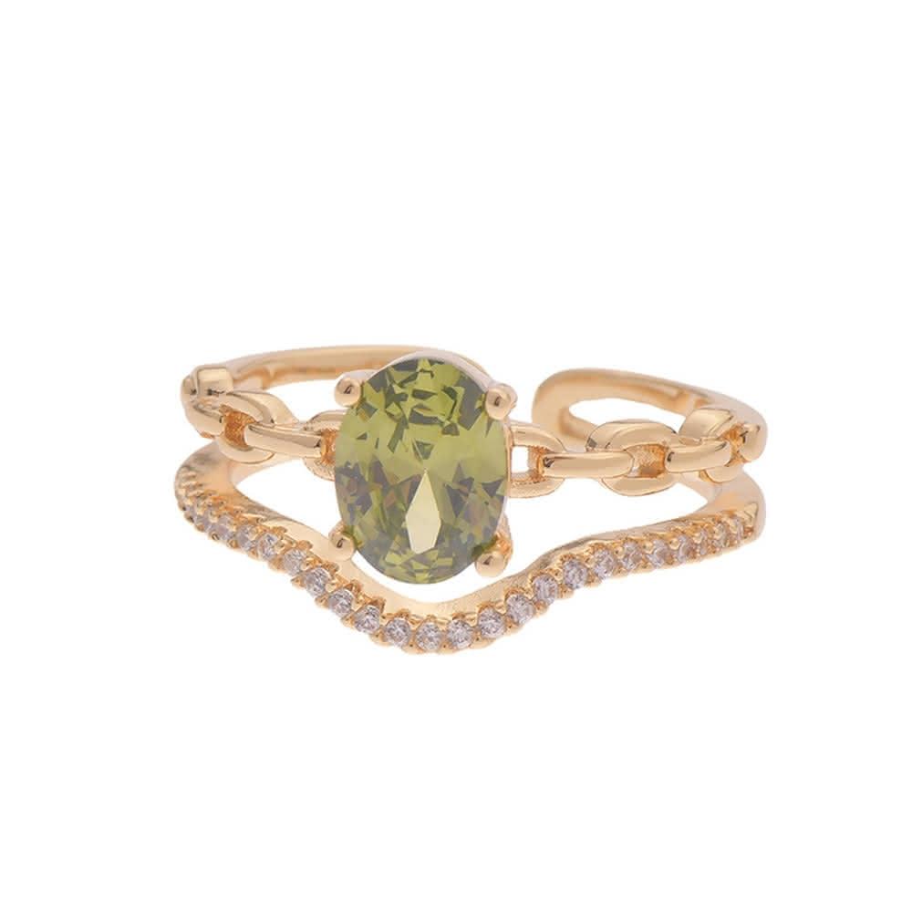 PoemAcc 鋯石輕奢戒指 橄欖綠紫色鋯石戒指(雙層鋯石鏈條戒指 法式輕奢設計 戒指 開口戒)