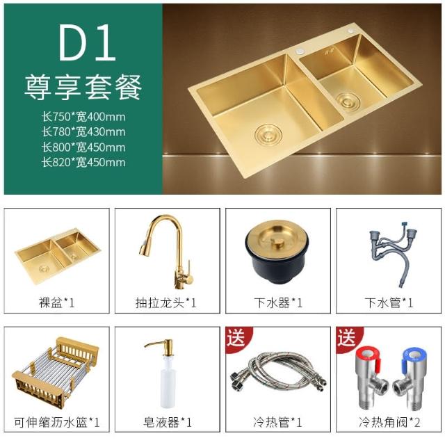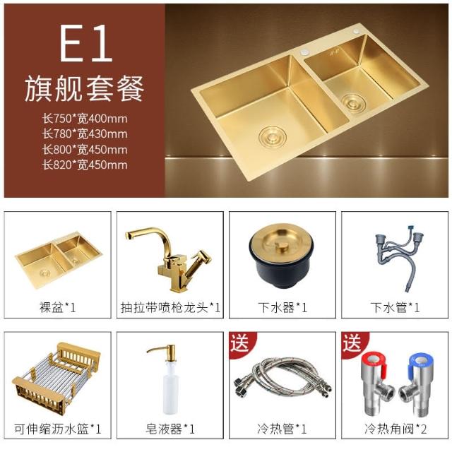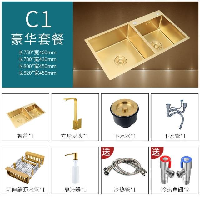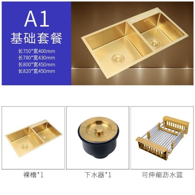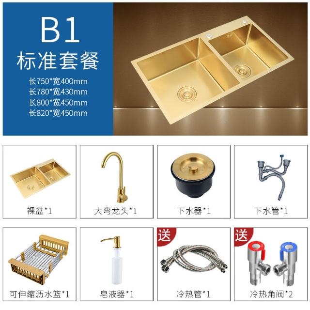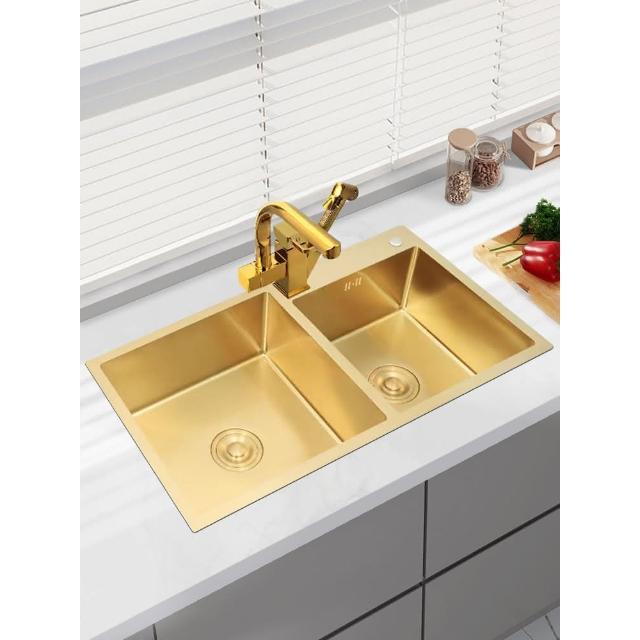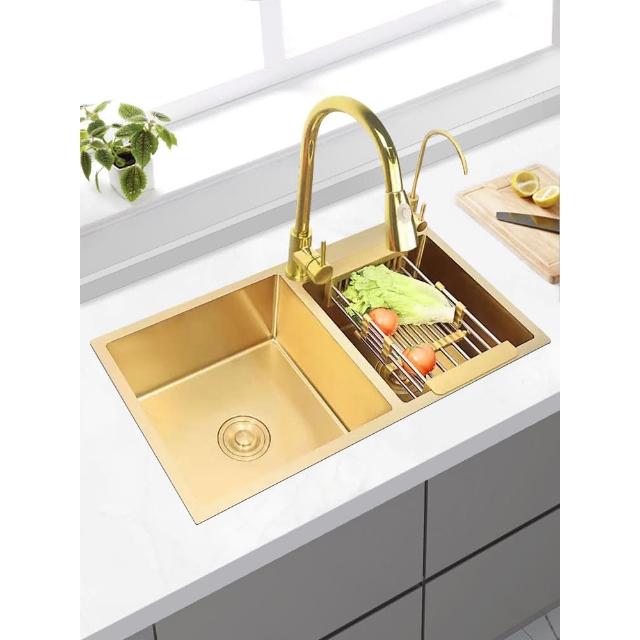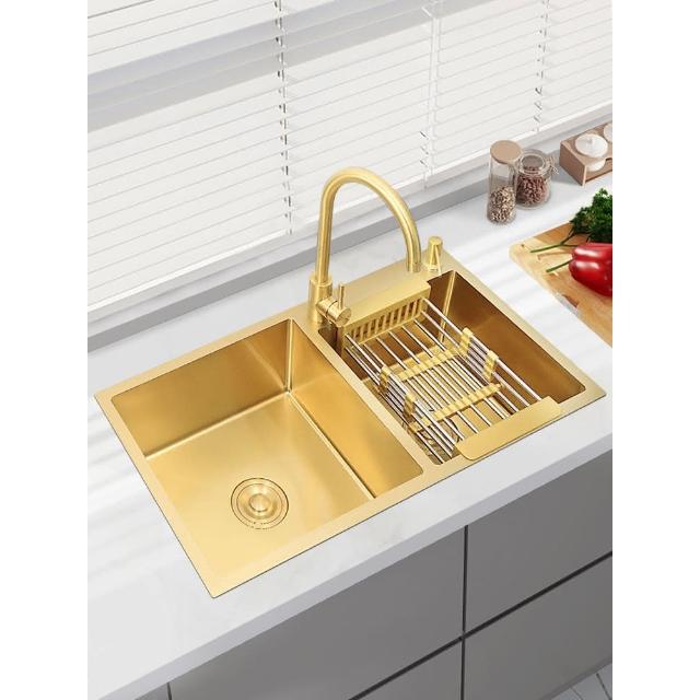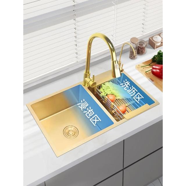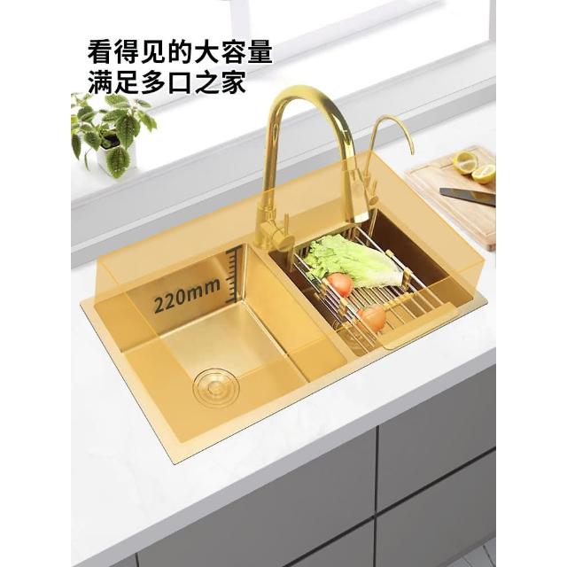 廚房洗菜盆家用304不銹鋼納米金色水槽大雙槽手工洗碗池加厚台下