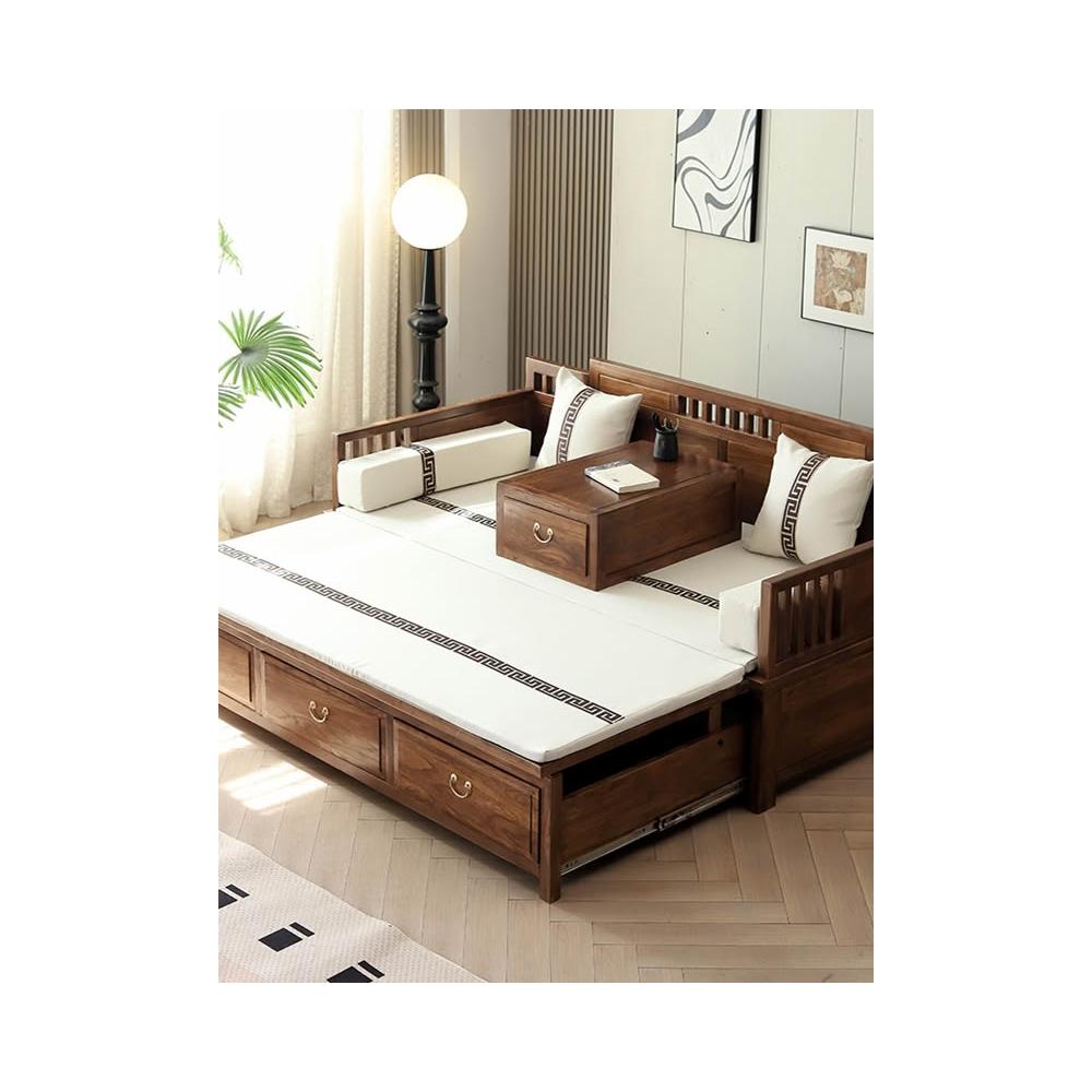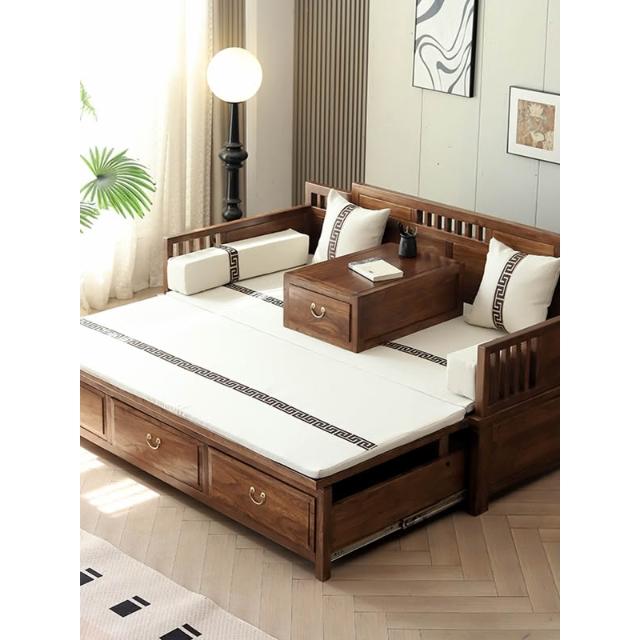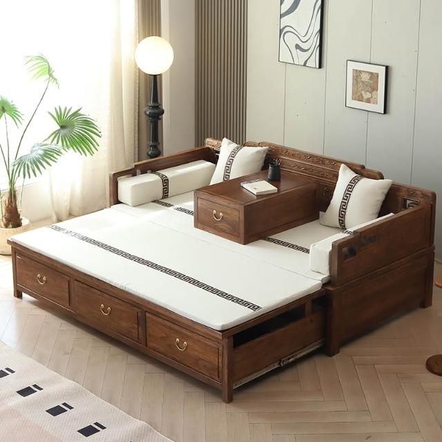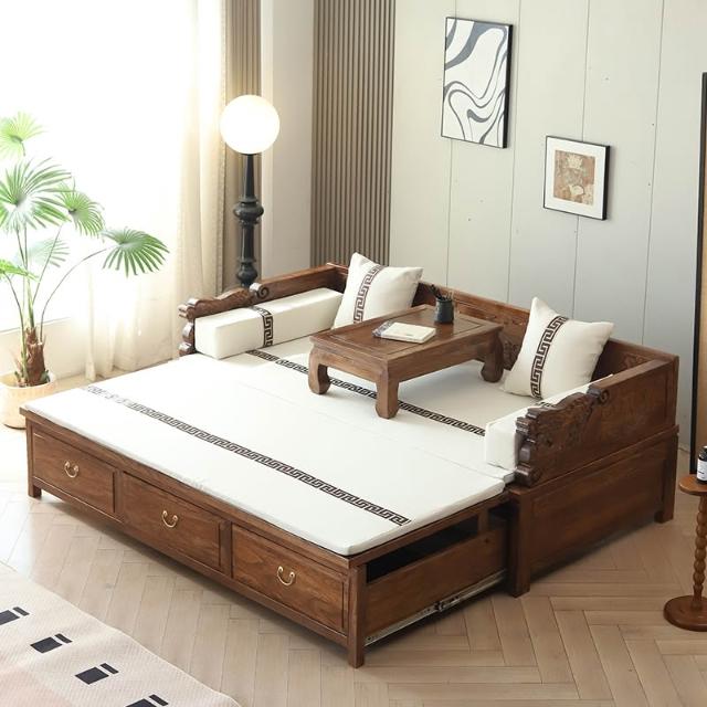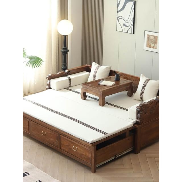 羅漢床推拉床老榆木羅漢床實木新中式沙發床兩用小戶型可伸縮傢俱