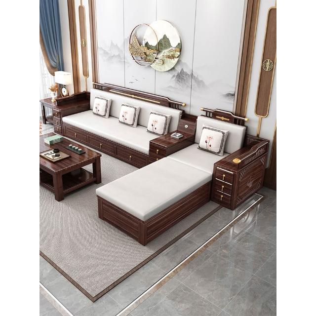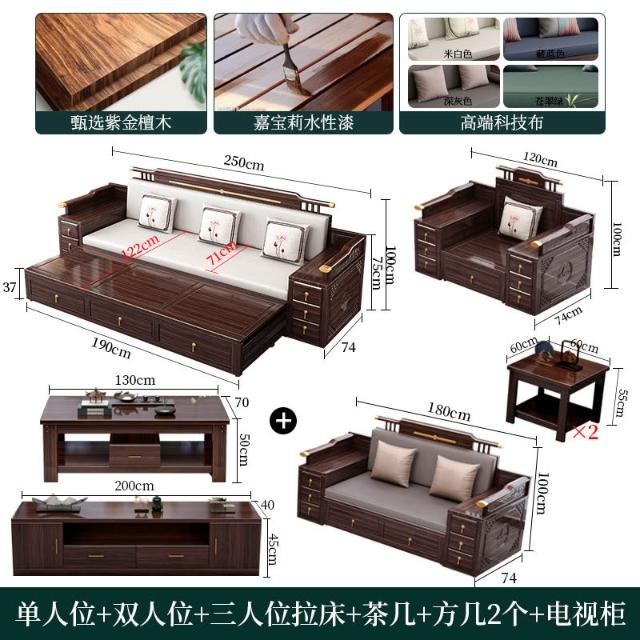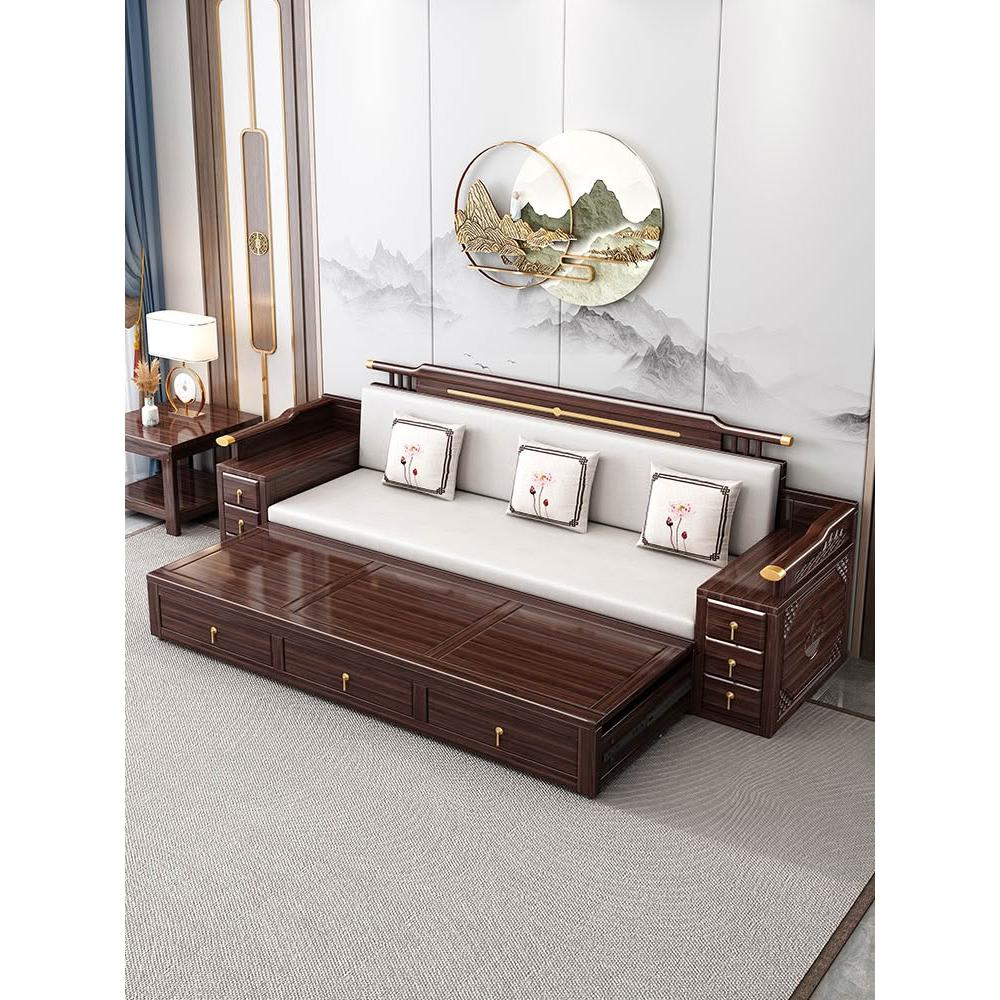 新中式紫金檀木實木沙發床組合客廳大小戶型羅漢床雕花伸縮木沙發